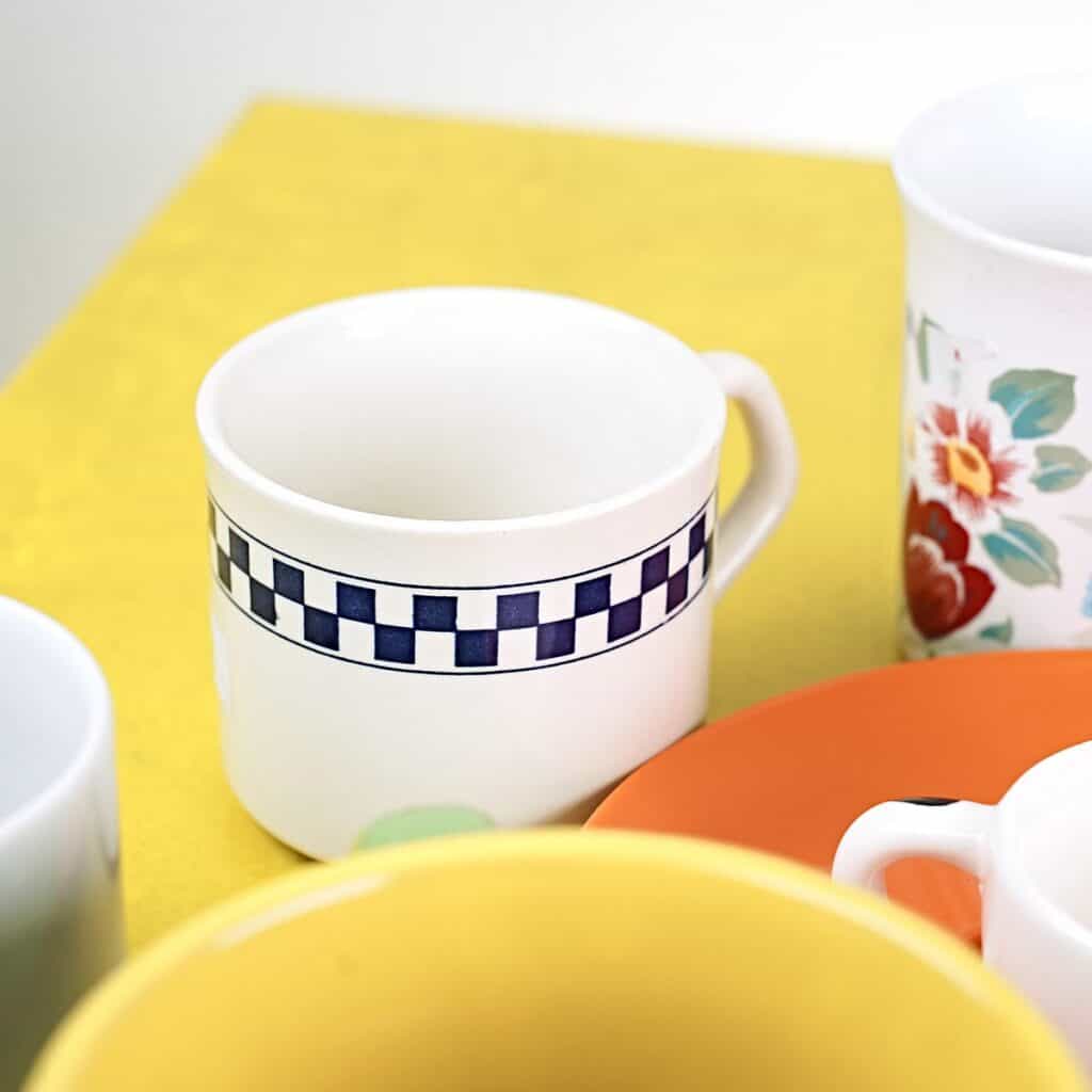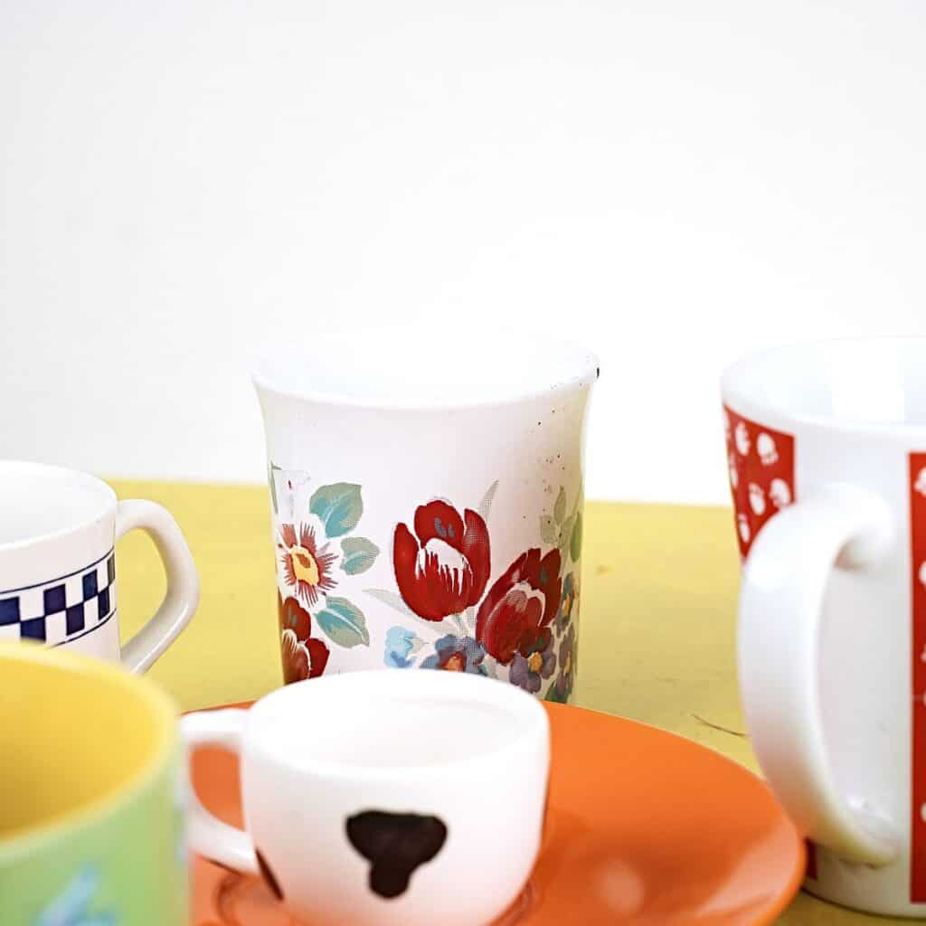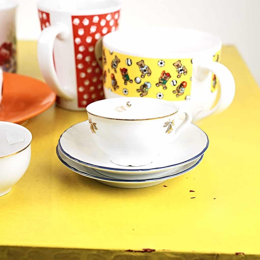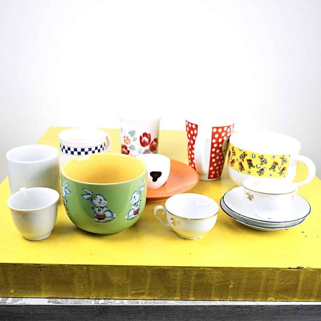 lotto di sei tazze e 4 tazzine più tre piattini con decori vari