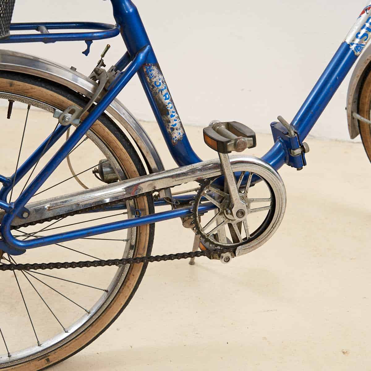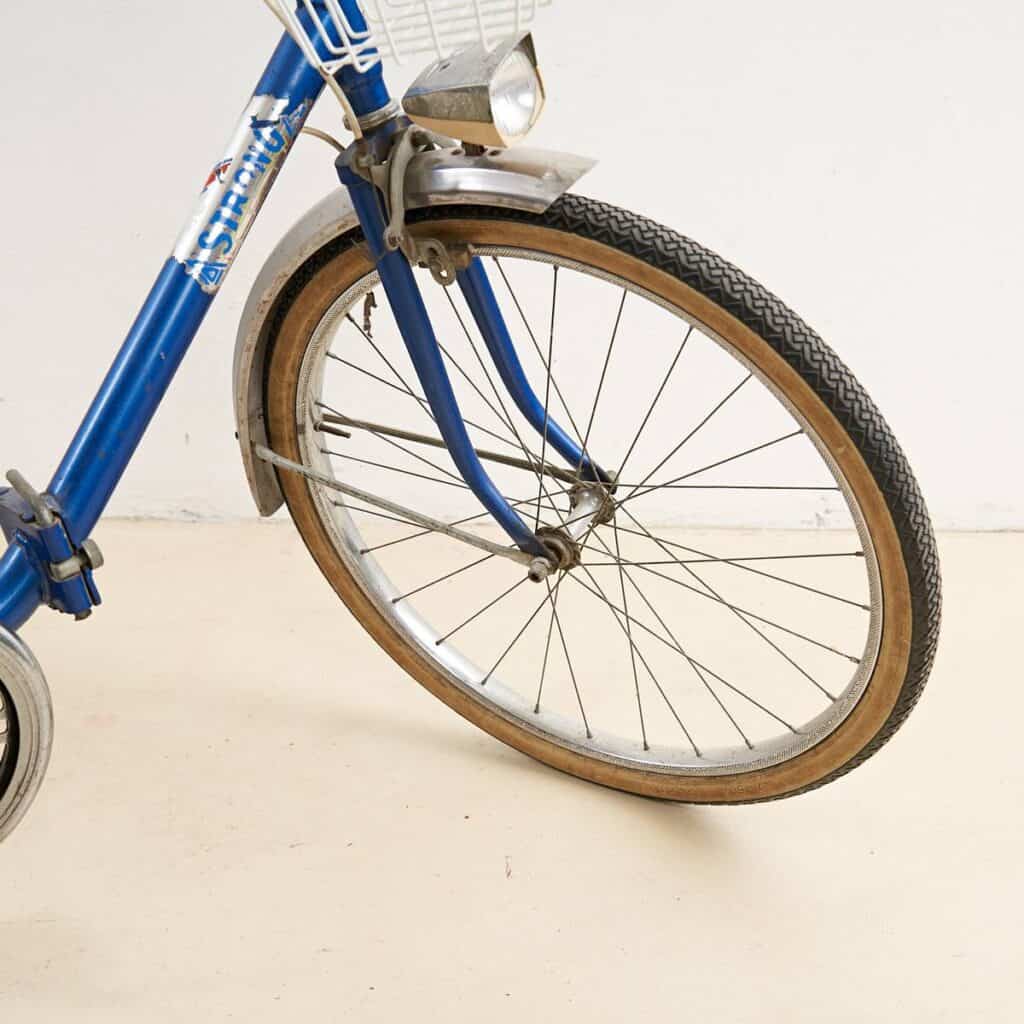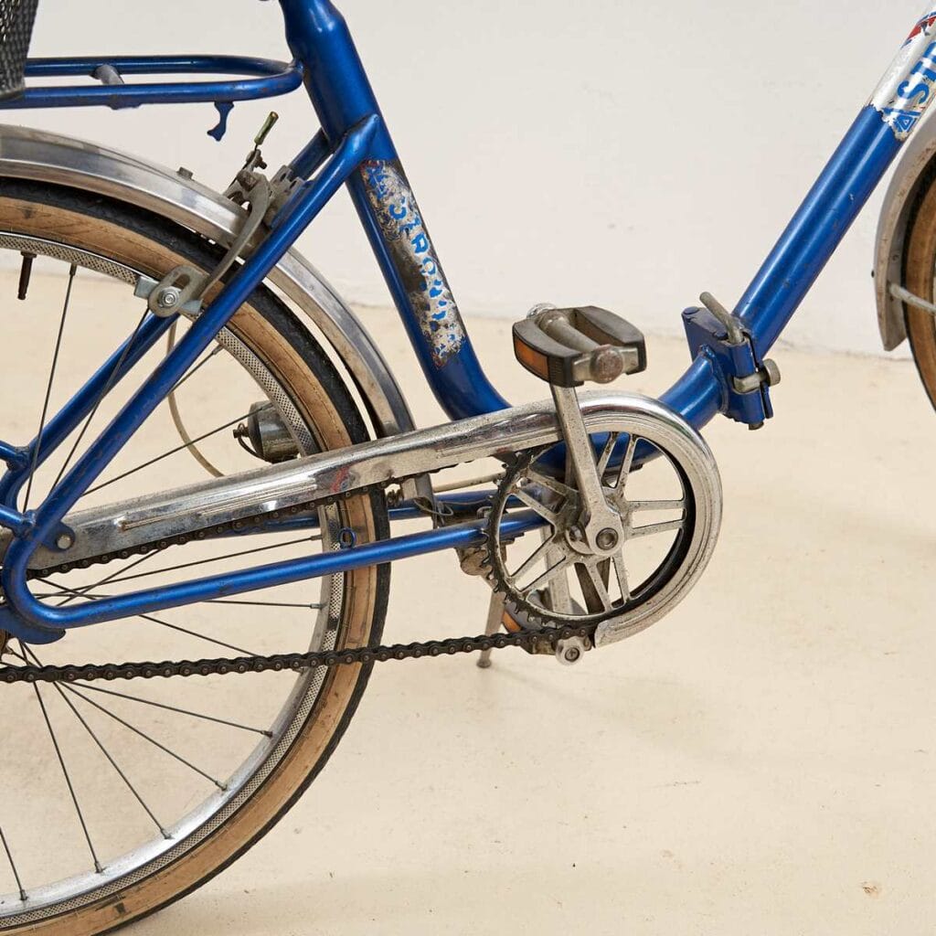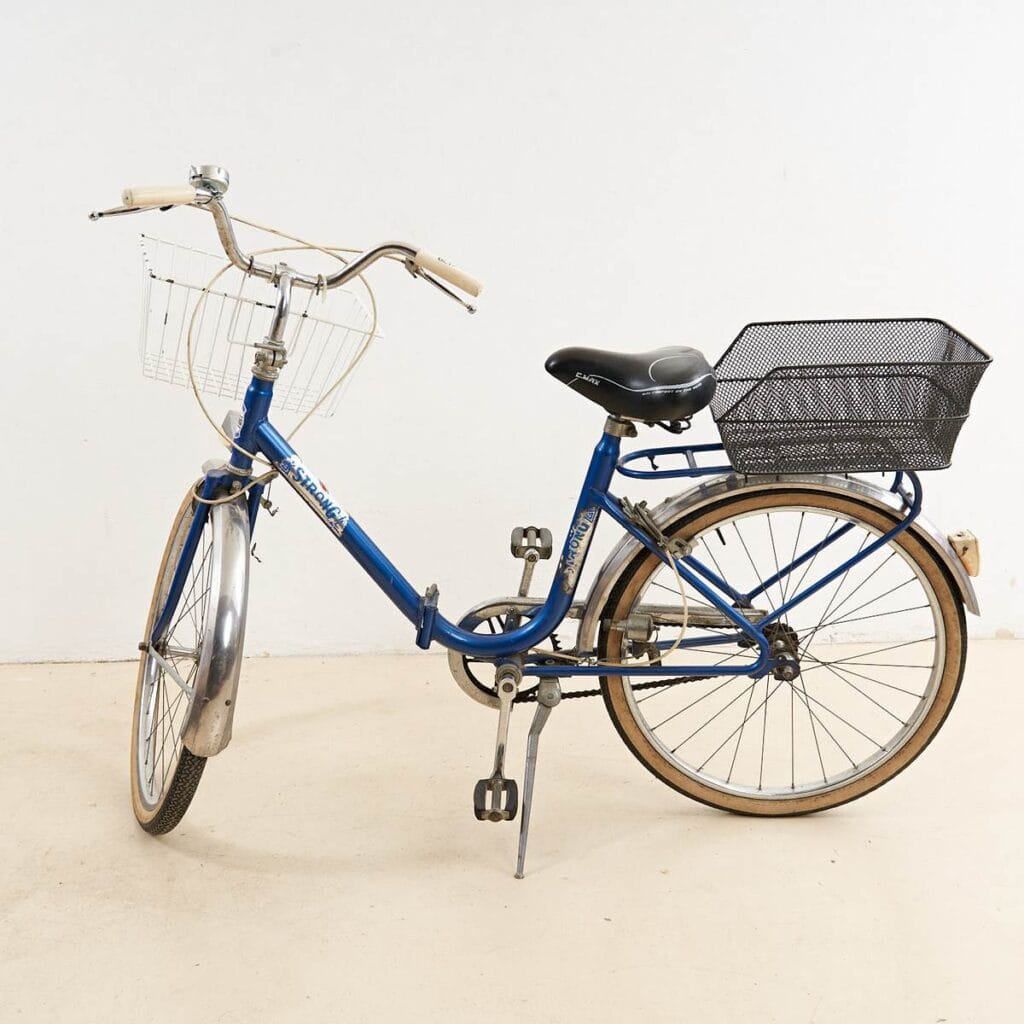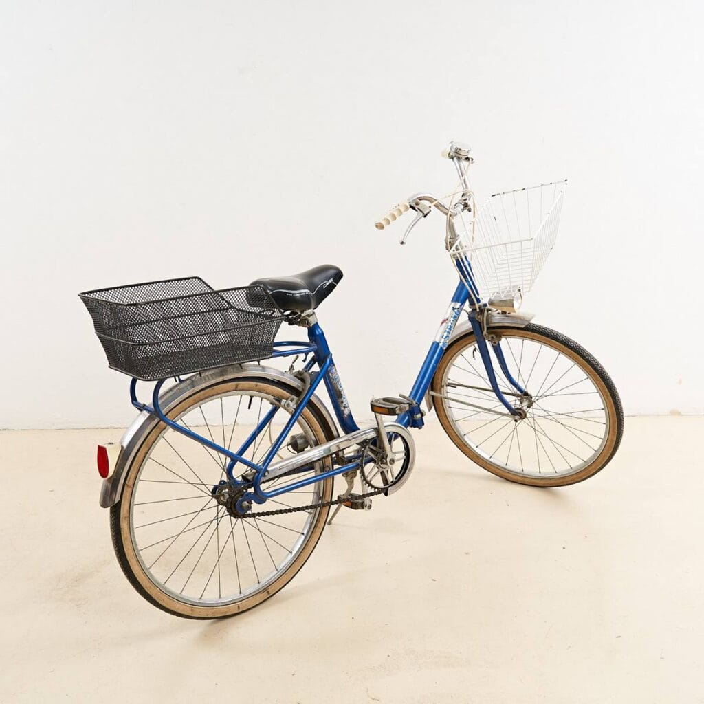 Questa affascinante bicicletta vintage, risalente agli anni '70, e' un perfetto esempio di design funzionale e stile retro'. Caratterizzata da una struttura robusta in metallo blu, la b... Questa affascinante bicicletta vintage, risalente agli anni '70, e' un perfetto esempio di design funzionale e stile retro'. Caratterizzata da una struttura robusta in metallo blu, la bici e' dotata di due pratici cesti: uno anteriore in metallo bianco e uno posteriore in nero, ideali per trasportare piccoli oggetti durante le passeggiate in citta'. I dettagli curati, come il manubrio elegante e la sellina ergonomica, offrono comfort e facilita' di guida. Presenta segnali di utilizzo, che ne conferiscono un fascino autentico e vintage. Perfetta per chi desidera un modo ecologico e stiloso di spostarsi, questa bicicletta e' ideale anche come decorazione retro in un ambiente urbano. Altro