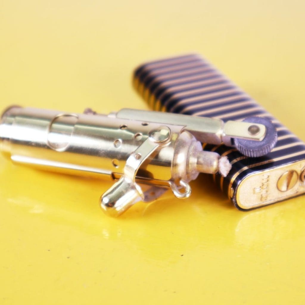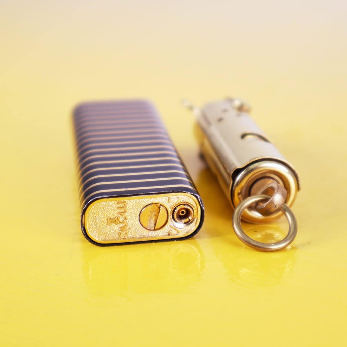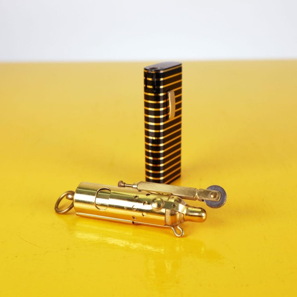 Scopri questa coppia di accendini vintage, perfetta per gli amanti del design d'epoca. Il primo accendino presenta una finitura dorata lucida con dettagli decorativi, mentre il secondo accendino ... Scopri questa coppia di accendini vintage, perfetta per gli amanti del design d'epoca. Il primo accendino presenta una finitura dorata lucida con dettagli decorativi, mentre il secondo accendino ha un elegante rivestimento a righe nere e oro. Realizzati con attenzione ai dettagli, sono accessori ideali per collezionisti o come oggetti decorativi su un tavolo. Entrambi i pezzi sono in ottime condizioni, con segni leggeri di utilizzo, e funzionano perfettamente. Aggiungi un tocco di stile re'tro al tuo arredamento o sorprendi un amico con un regalo unico! Altro