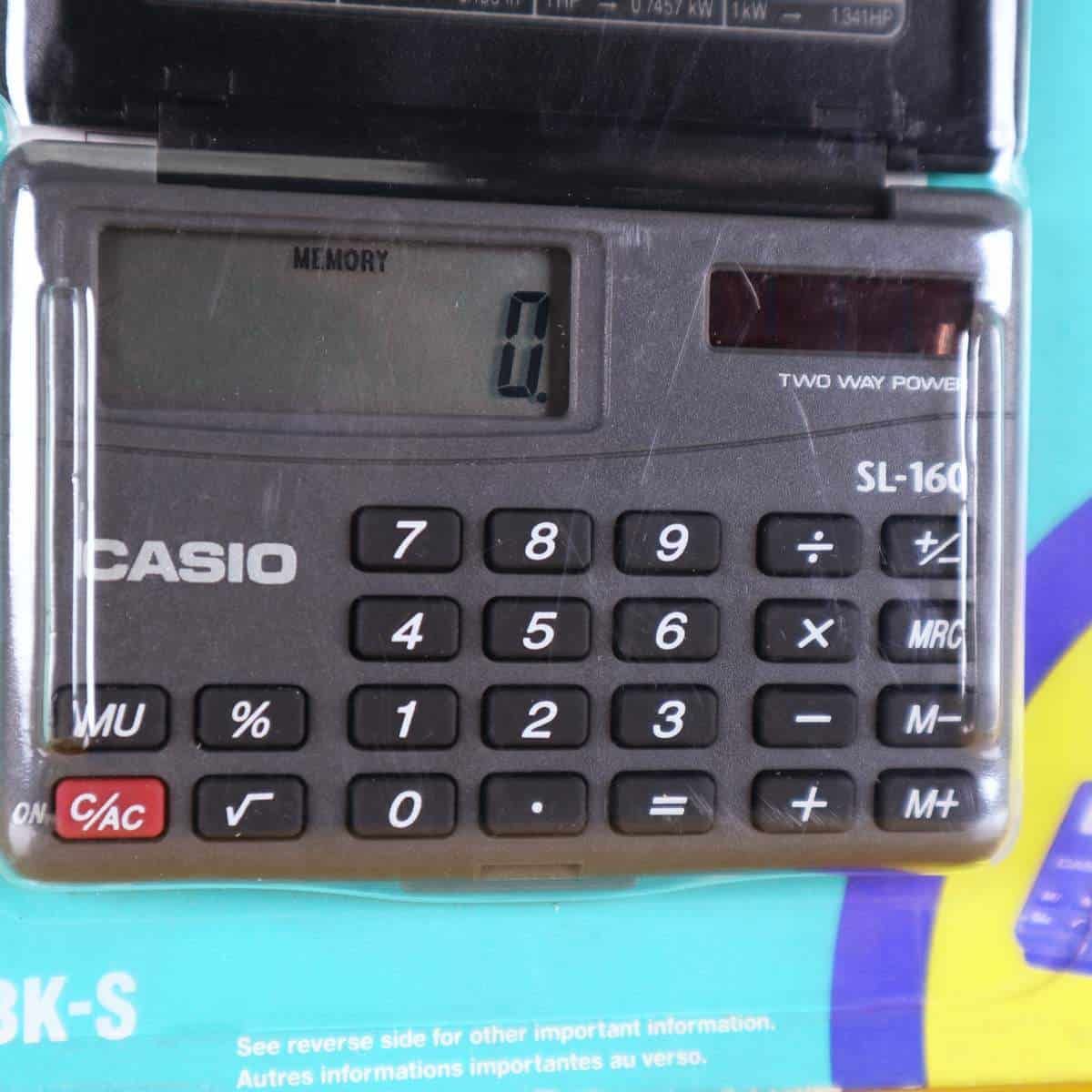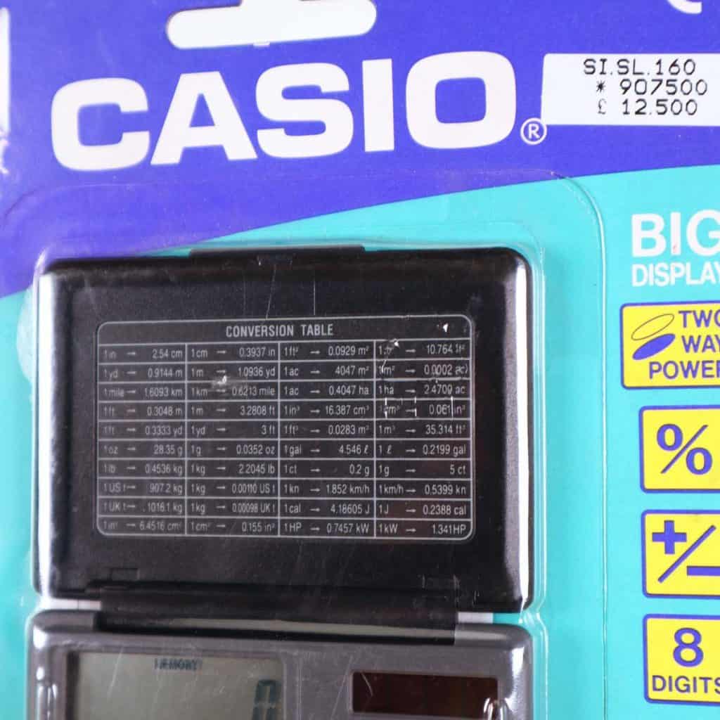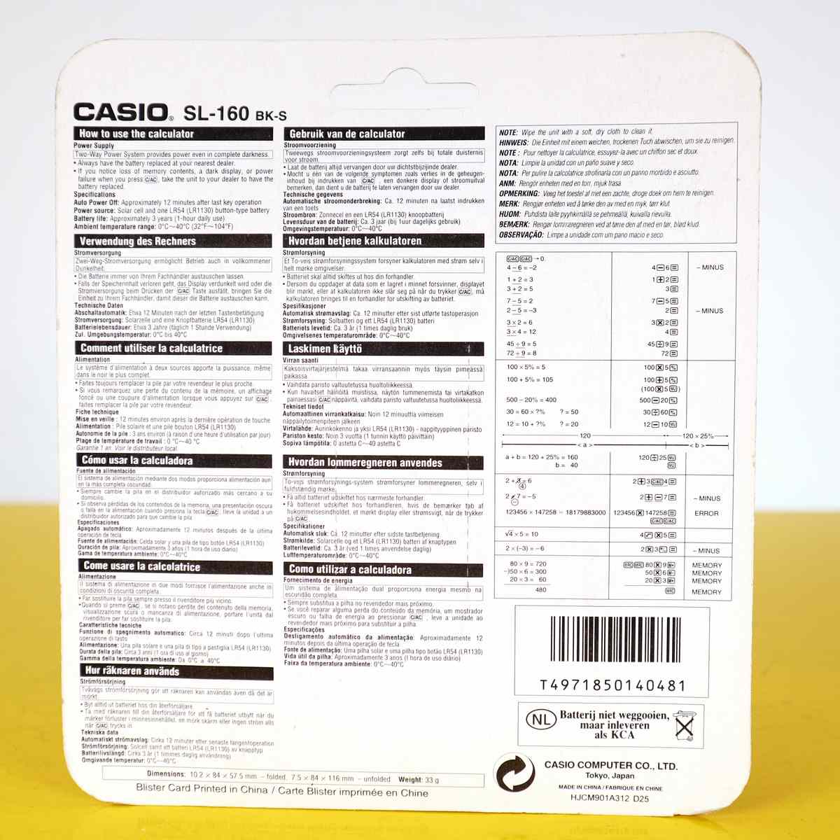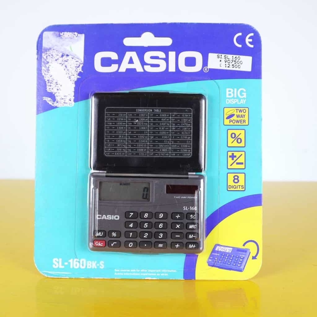 Scopri la calcolatrice Casio SL-160BK-S, un oggetto vintage che unisce funzionalita' e design essenziale. Progettata per un utilizzo quotidiano, questa calcolatrice portatile offre un grande disp... Scopri la calcolatrice Casio SL-160BK-S, un oggetto vintage che unisce funzionalita' e design essenziale. Progettata per un utilizzo quotidiano, questa calcolatrice portatile offre un grande display e tasti intuitivi, rendendo le operazioni matematiche un gioco da ragazzi. Con un design compatto, e' perfetta per l'uso a scuola, in ufficio o a casa. Realizzata in plastica resistente, presenta una colorazione grigia e nera con dettagli blu. Nonostante segni di usura, mantiene un aspetto affascinante, ricco di storia. Un accessorio pratico da avere sempre a portata di mano. Altro