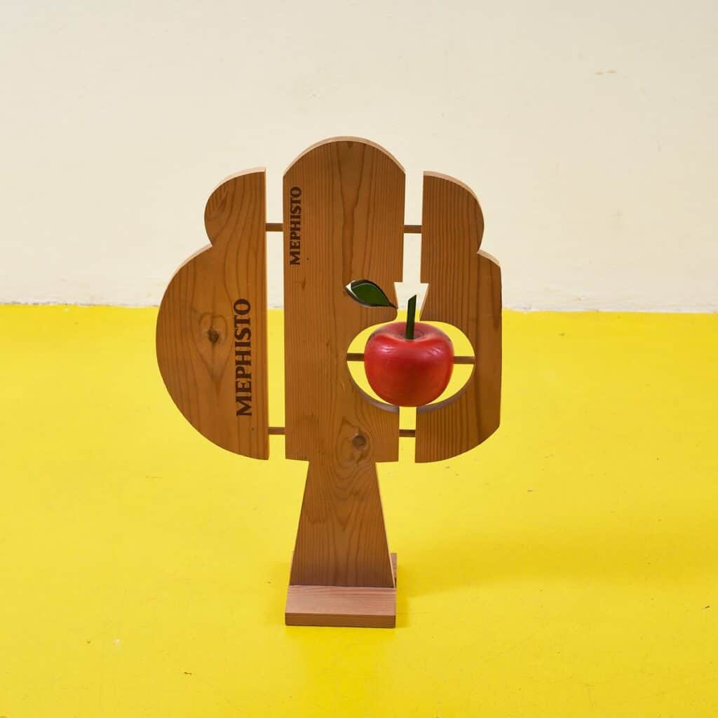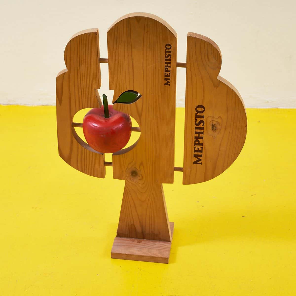 Scopri un pezzo unico di design contemporaneo che cattura l'attenzione. Questa scultura, realizzata in legno di alta qualita', rappresenta un'allegoria stilizzata di un albero con una m... Scopri un pezzo unico di design contemporaneo che cattura l'attenzione. Questa scultura, realizzata in legno di alta qualita', rappresenta un'allegoria stilizzata di un albero con una mela rossa pendente, simbolo di creativita' e freschezza. Il logo 'Mephisto' inciso conferisce un tocco di autenticita' e storia. Ideale per arricchire il tuo spazio abitativo o lavorativo, questo oggetto non e' solo decorativo, ma anche un vera e propria dichiarazione di stile. La finitura naturale del legno si sposa perfettamente con la vivace tonalita' della mela, creando un equilibrio visivo straordinario. Altro