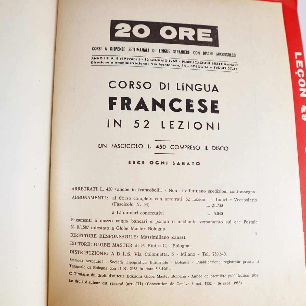 Questa collezione unica di dischi in vinile mostra un affascinante capitolo dell'insegnamento delle lingue. Comprendente piu' di quattro dischi della serie '20 ORE', questa raccolt... Questa collezione unica di dischi in vinile mostra un affascinante capitolo dell'insegnamento delle lingue. Comprendente piu' di quattro dischi della serie '20 ORE', questa raccolta vintage e' stata prodotta da Globe Master negli anni '60. Ogni disco e' contenuto in una copertina illustrativa vivace, progettata per attrarre l'attenzione. Realizzati in vinile, i dischi presentano un design grafico distintivo e caratteristiche originali che li rendono un pezzo da collezione. Perfetti per appassionati di linguistica o amanti del vintage, questi dischi combinano l'apprendimento di una lingua con un'estetica unica. Ideali come decorazione o per ascolti nostalgici. Altro