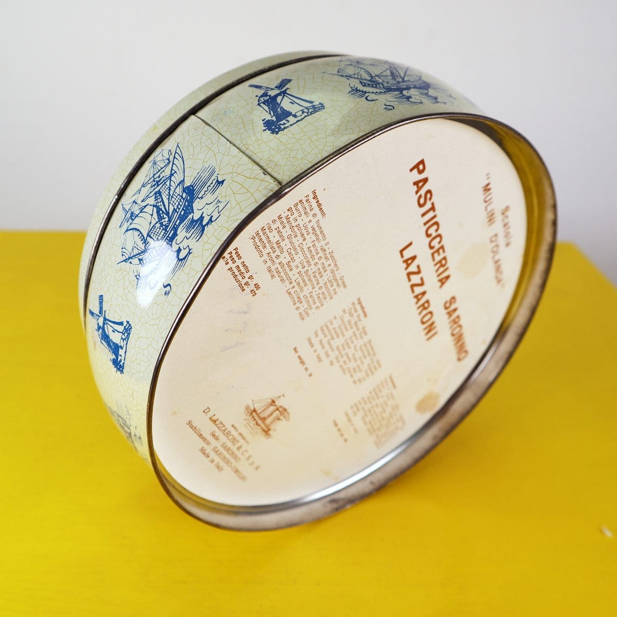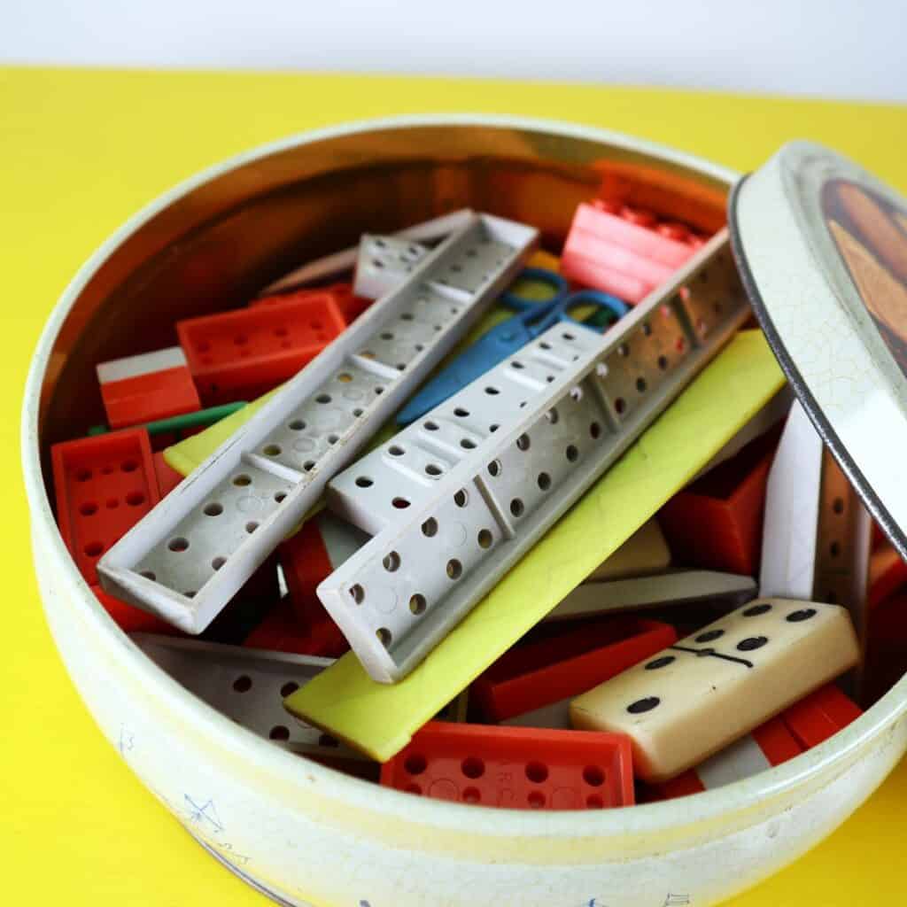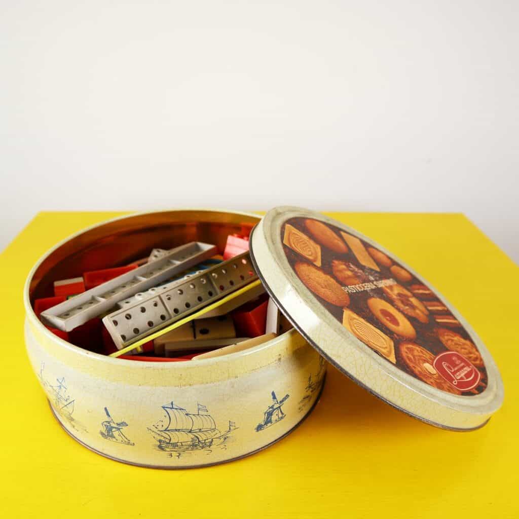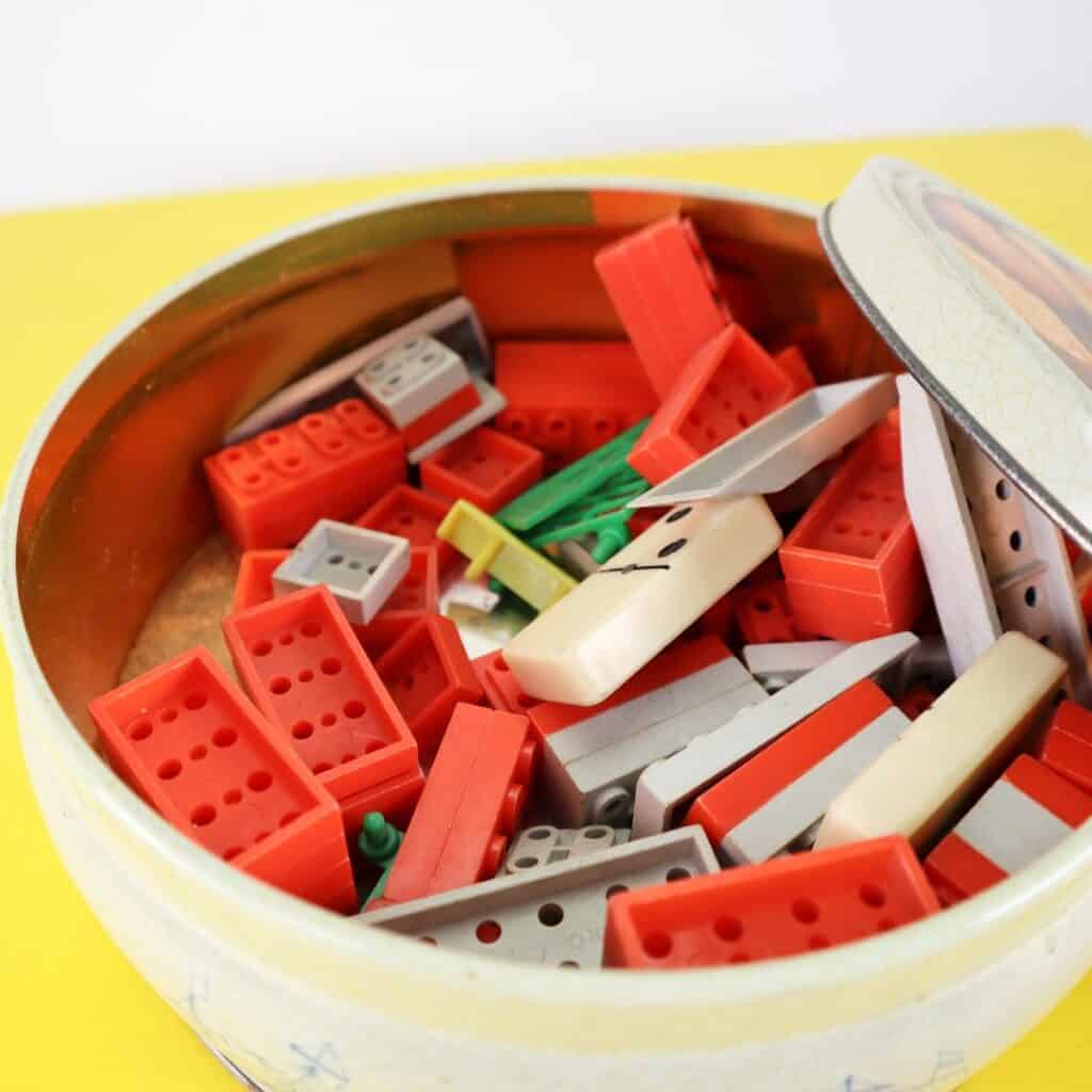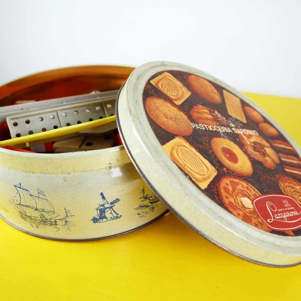 scatola in latta con mattoncini vintage
