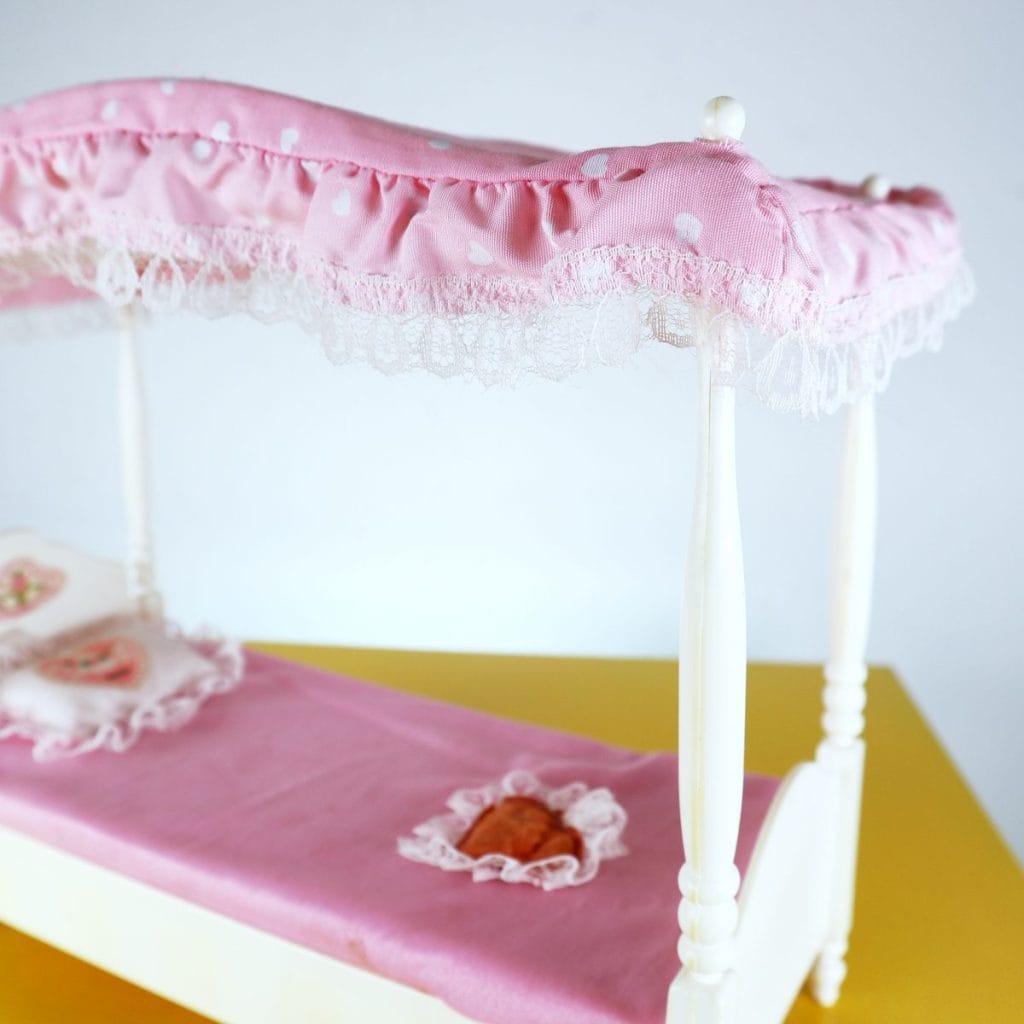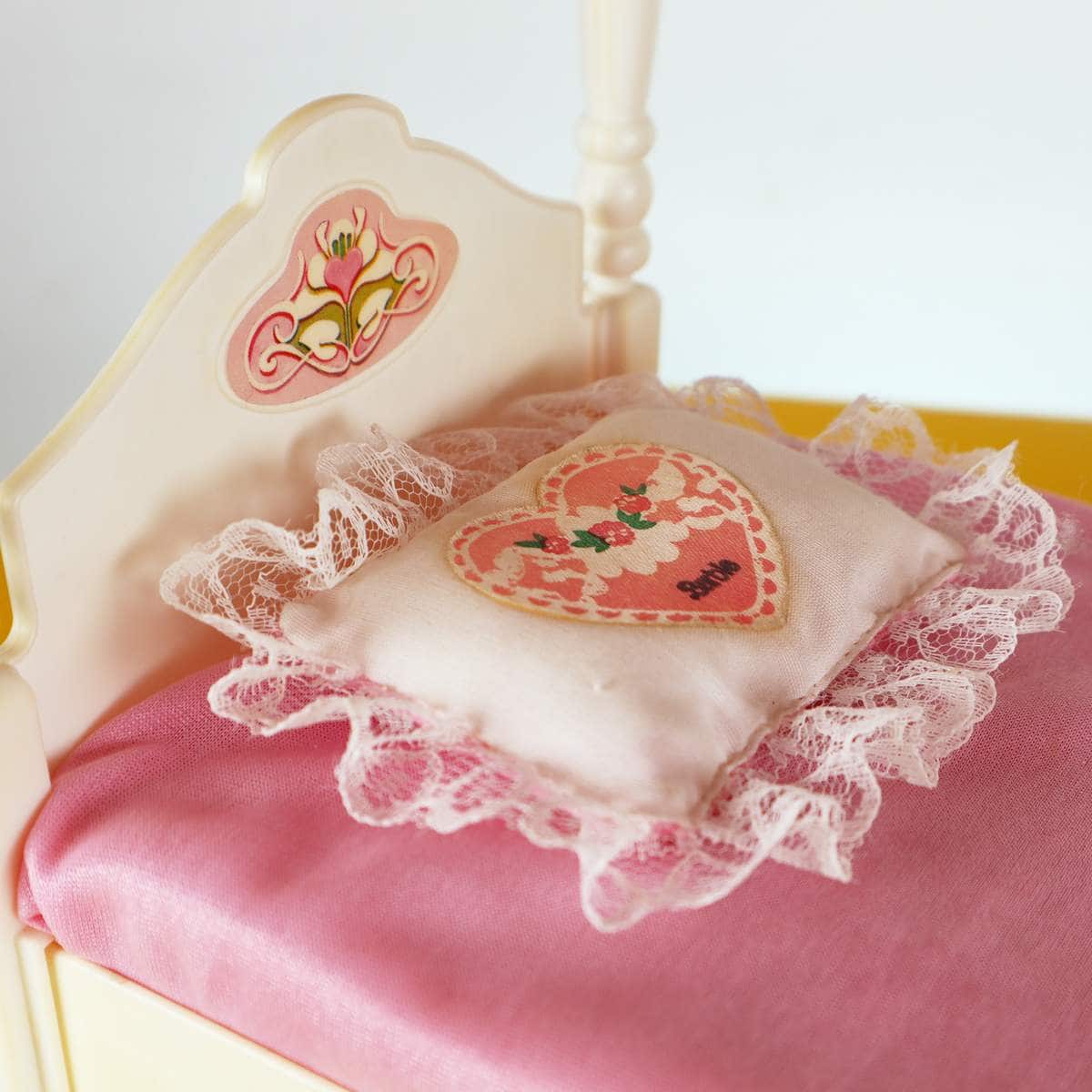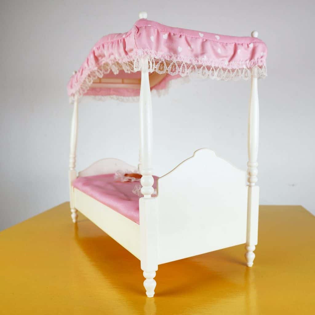Questo affascinante letto per bambola, realizzato dalla Mattel nel 1982, è un pezzo d"arte unica per collezionisti e amanti di Barbie. Presenta una struttura elegante con un cabriolet in legno e un ba... Questo affascinante letto per bambola, realizzato dalla Mattel nel 1982, è un pezzo d"arte unica per collezionisti e amanti di Barbie. Presenta una struttura elegante con un cabriolet in legno e un baldacchino in tessuto rosa, decorato con pizzo che aggiunge un tocco di raffinatezza. I cuscini sono romantici, con ricami dolci, perfetti per ogni bambola. Questo letto è ideale non solo come elemento decorativo, ma anche come complemento per giochi di ruolo, stimolando la fantasia delle più piccole. In condizioni molto buone, porta con sà© una storia affascinante e un design senza tempo. Altro
