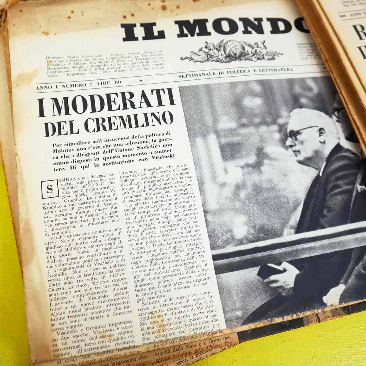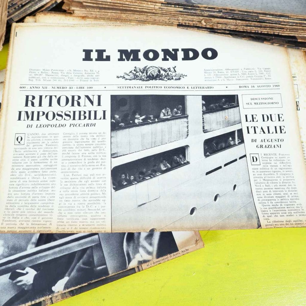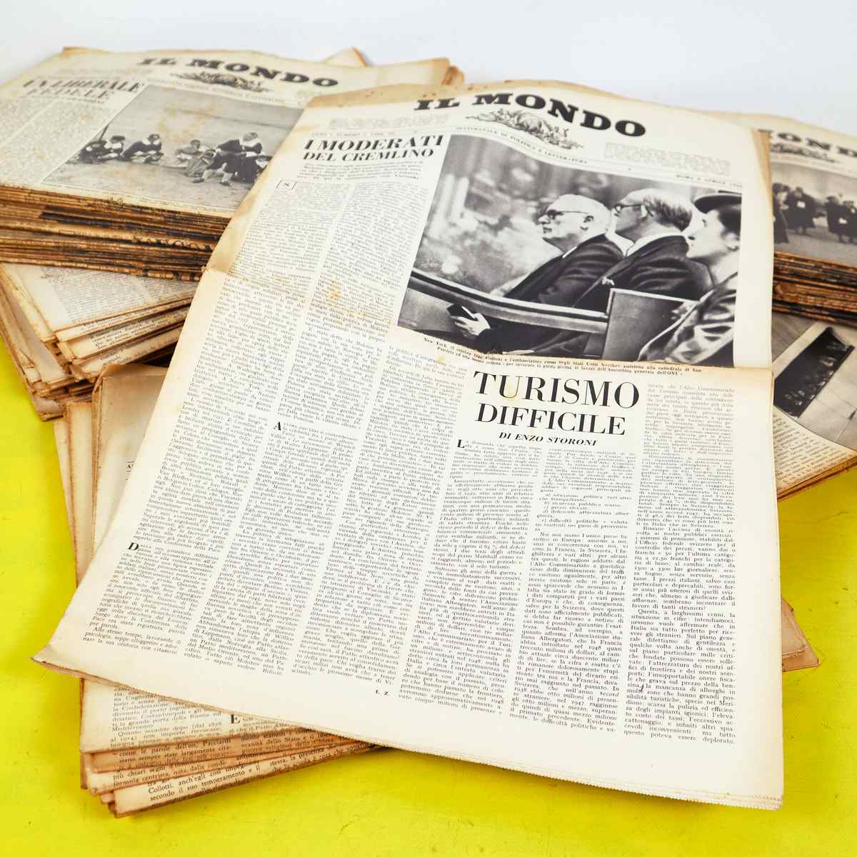Questa affascinante collezione di settimanali vintage, intitolati 'Il Mondo', risale agli anni '50 e '60, un vero pezzo della storia editoriale italiana. I giornali presentano arti... Questa affascinante collezione di settimanali vintage, intitolati 'Il Mondo', risale agli anni '50 e '60, un vero pezzo della storia editoriale italiana. I giornali presentano articoli di politica e cultura dell'epoca, con titoli iconici come 'I Moderati del Cremlino' e 'La Tela Strappata'. Ogni numero e' un viaggio nel passato, con pagine ingiallite che raccontano eventi storici e figure significative. Non solo un oggetto da collezione, ma un'opera d'arte della stampa che puo' essere esposta, utilizzata per decorazioni d'interni o studi di storia contemporanea. Perfetti per gli appassionati di storia, collezionismo e vintage. Altro