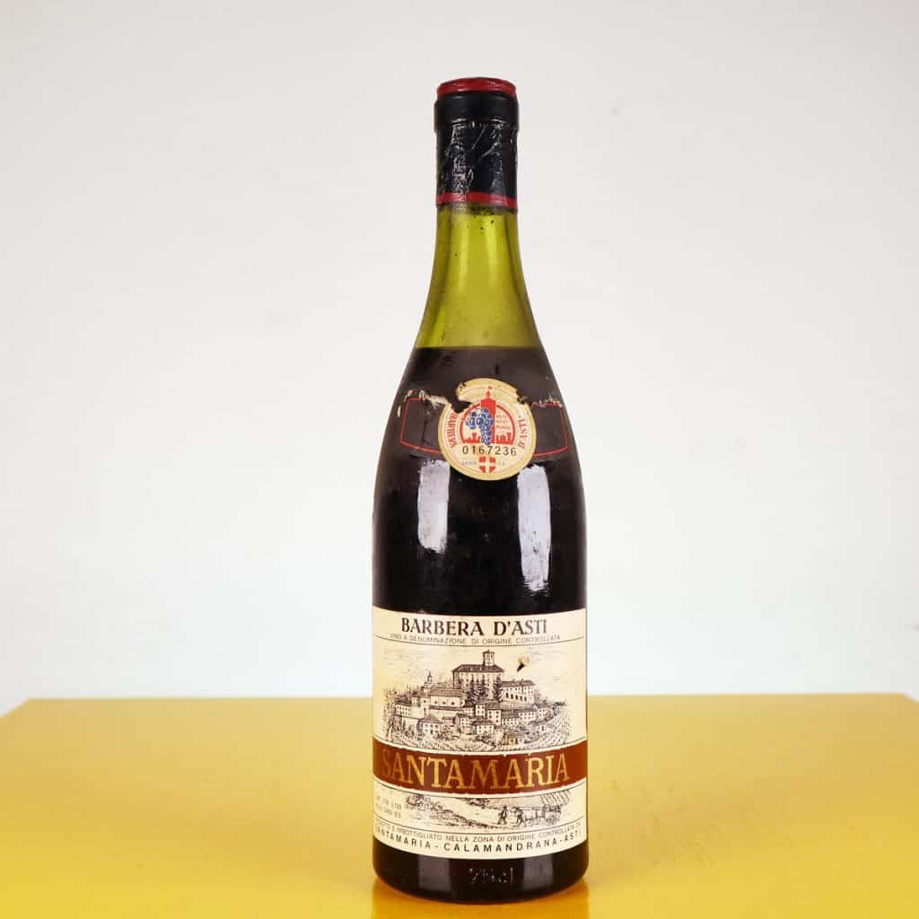 Questa bottiglia di Barbera d"Asti, con un"affascinante etichetta vintage, rappresenta un pezzo autentico di storia vinicola. Proveniente dalla rinomata azienda Santamaria, la bottiglia contiene 0.720... Questa bottiglia di Barbera d"Asti, con un"affascinante etichetta vintage, rappresenta un pezzo autentico di storia vinicola. Proveniente dalla rinomata azienda Santamaria, la bottiglia contiene 0.720 litri di vino, con un contenuto alcolico di 12,5%. L"etichetta mostra un paesaggio collinare con un castello, evocando l"antica tradizione vinicola della regione. Le condizioni generali della bottiglia presentano segni di usura ma non ne compromettono l"integrità, rendendola ideale per collezionisti o per una decorazione raffinata. Perfetta per occasioni speciali o come pezzo di esposizione in una cantina. Altro