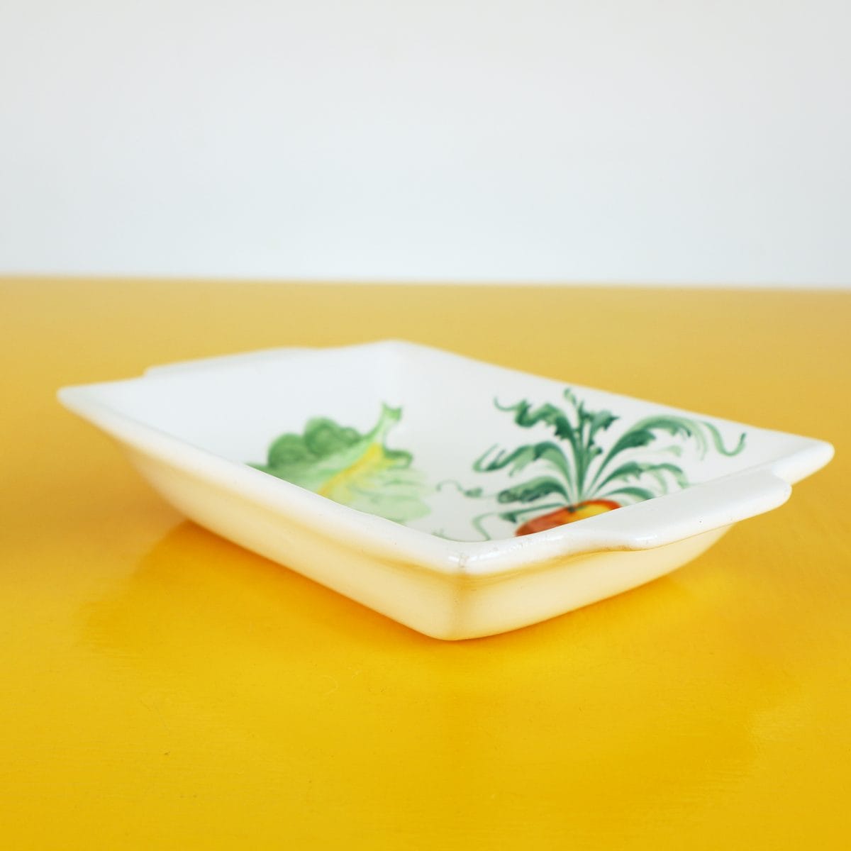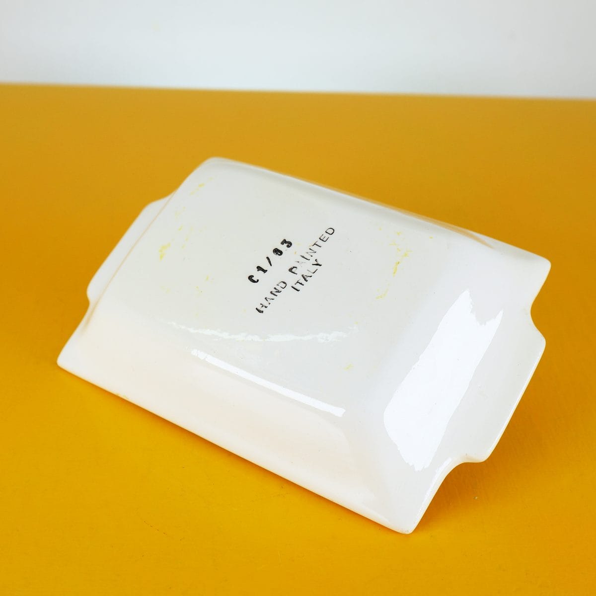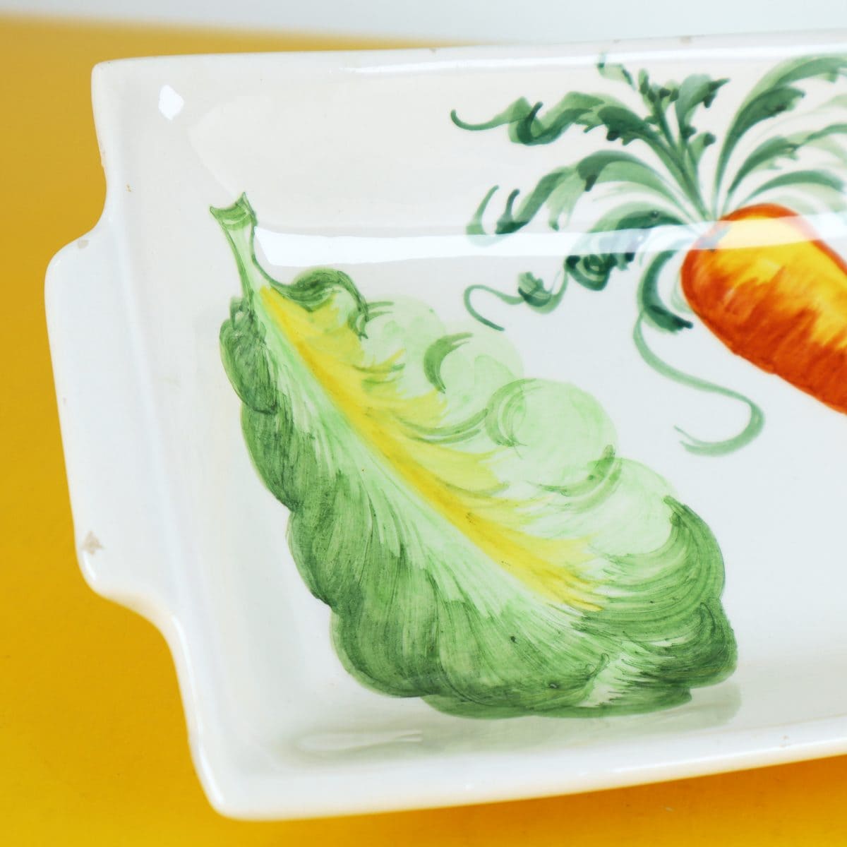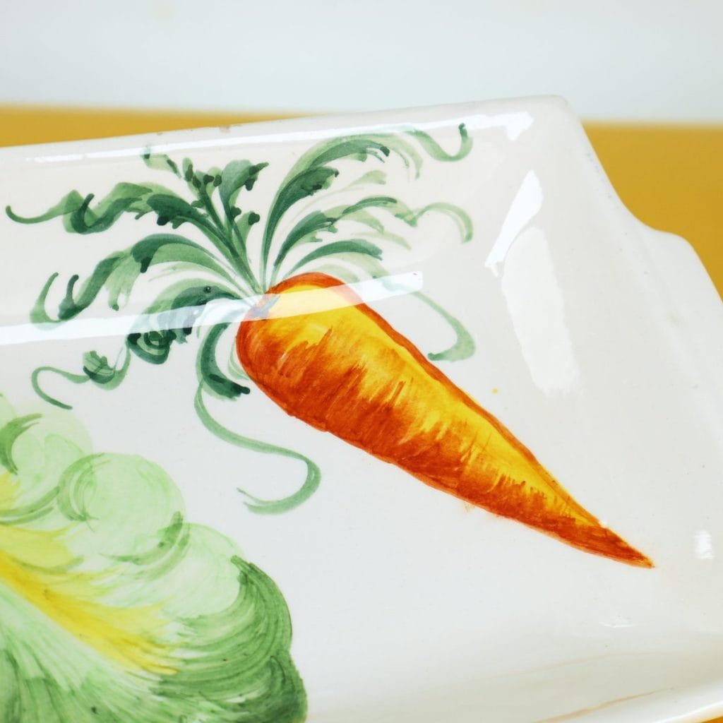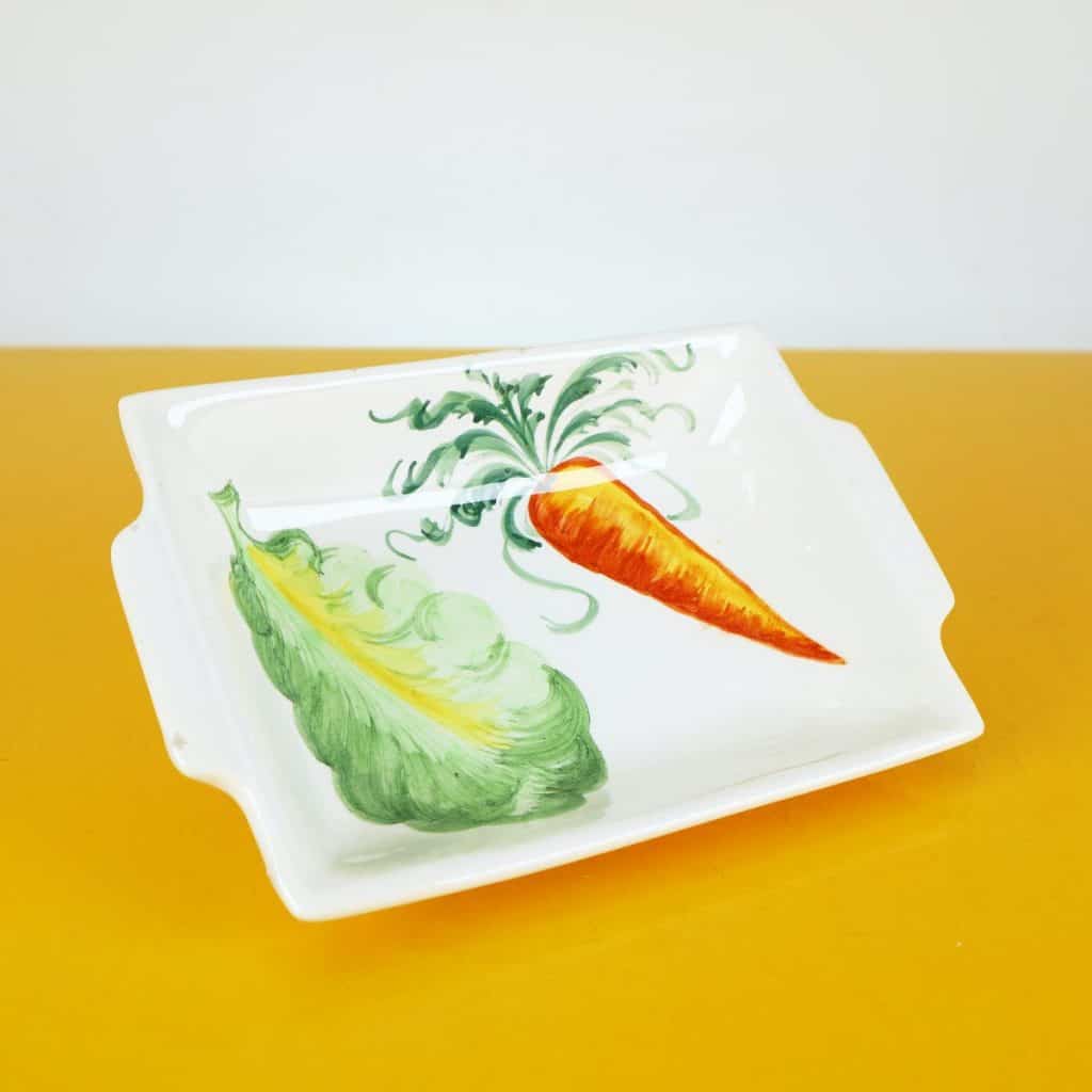 Questo splendido piatto in ceramica, sapientemente dipinto a mano, presenta due vivaci ortaggi: una carota arancione e una foglia di insalata verde, riflettendo un design fresco e colorato. Con un pro... Questo splendido piatto in ceramica, sapientemente dipinto a mano, presenta due vivaci ortaggi: una carota arancione e una foglia di insalata verde, riflettendo un design fresco e colorato. Con un profilo rettangolare e bordi leggermente rialzati, è perfetto per servire antipasti o come pezzo decorativo per la tua tavola. La ceramica presenta lievi segni d"uso, che testimoniano la sua storia e l"autenticità artigianale. Realizzato in Italia, questo oggetto trasmette un fascino vintage che si sposa bene con qualsiasi arredamento. La combinazione di colori vividi e il design tradizionale lo rendono un"aggiunta ideale alla tua collezione di stoviglie o come regalo per appassionati di arte culinaria. Altro