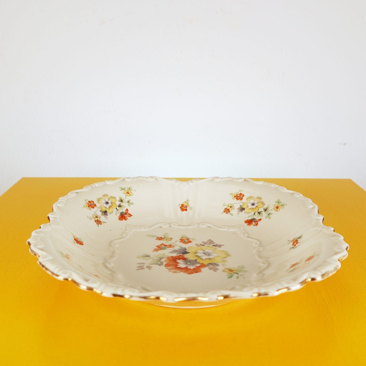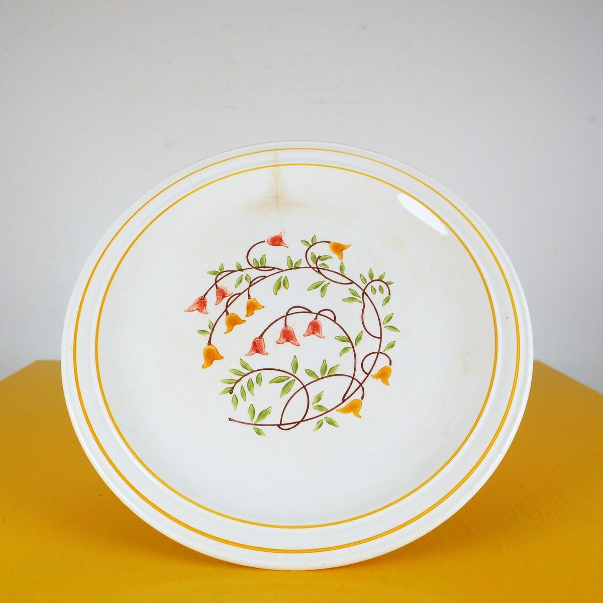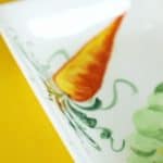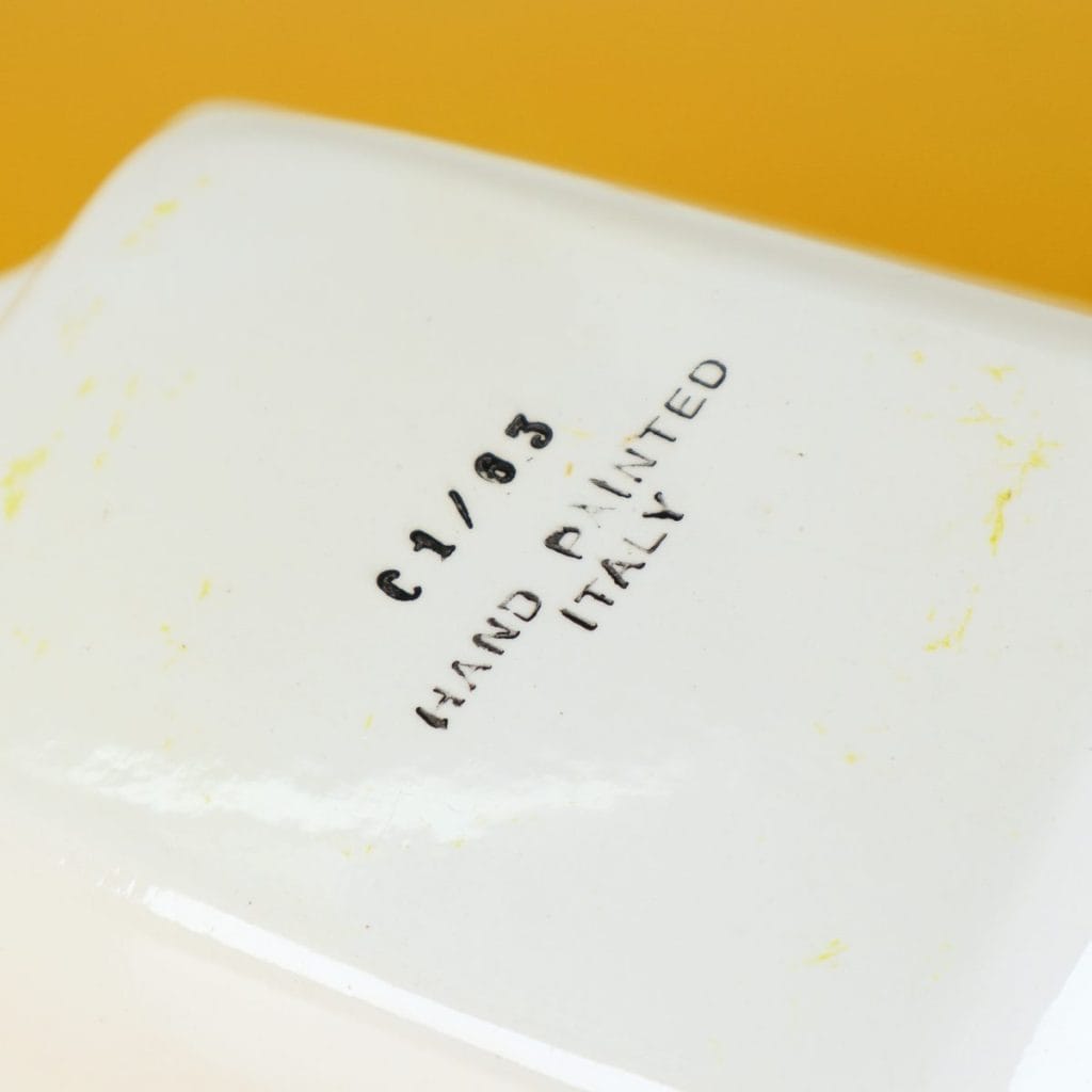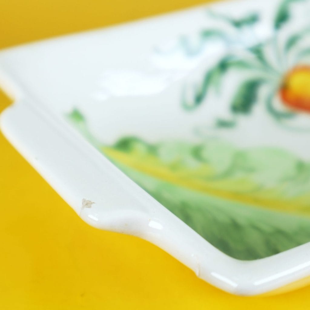 Questo splendido piatto in ceramica, sapientemente dipinto a mano, presenta due vivaci ortaggi: una carota arancione e una foglia di insalata verde, riflettendo un design fresco e colorato. Con un pro... Questo splendido piatto in ceramica, sapientemente dipinto a mano, presenta due vivaci ortaggi: una carota arancione e una foglia di insalata verde, riflettendo un design fresco e colorato. Con un profilo rettangolare e bordi leggermente rialzati, è perfetto per servire antipasti o come pezzo decorativo per la tua tavola. La ceramica presenta lievi segni d"uso, che testimoniano la sua storia e l"autenticità artigianale. Realizzato in Italia, questo oggetto trasmette un fascino vintage che si sposa bene con qualsiasi arredamento. La combinazione di colori vividi e il design tradizionale lo rendono un"aggiunta ideale alla tua collezione di stoviglie o come regalo per appassionati di arte culinaria. Altro