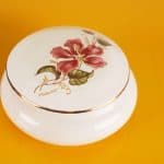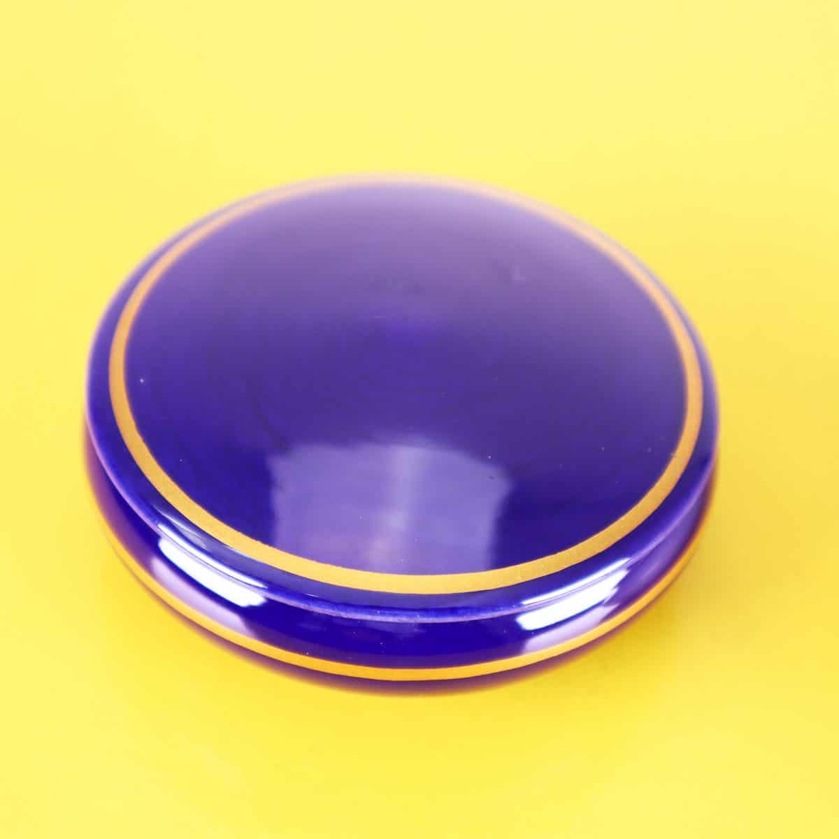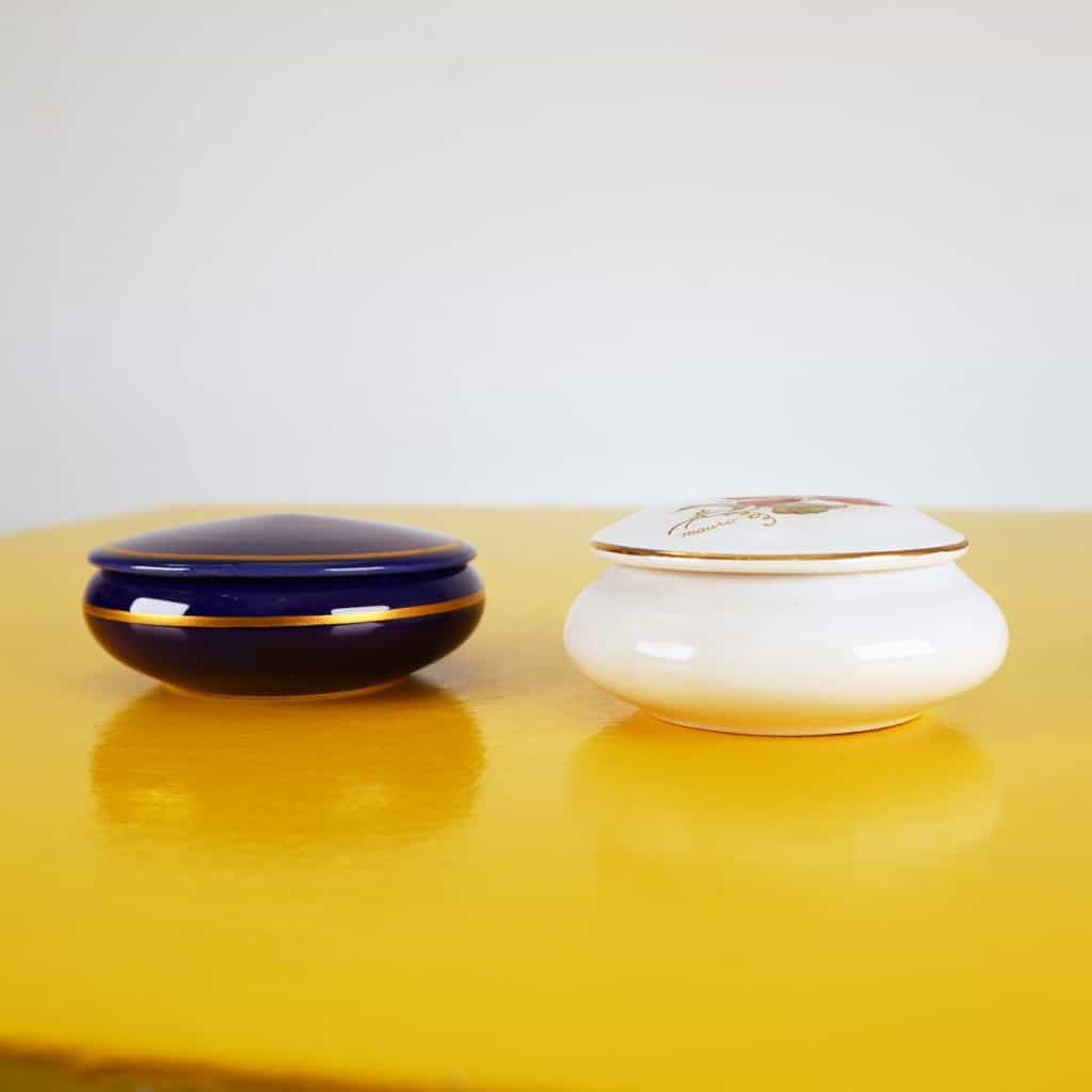 Questo incantevole set di scatole in ceramica è un perfetto esempio di design vintage. Comprende due scatole, una blu e una bianca, entrambe adornate con dettagli dorati e motivi floreali. La scatola ... Altro