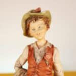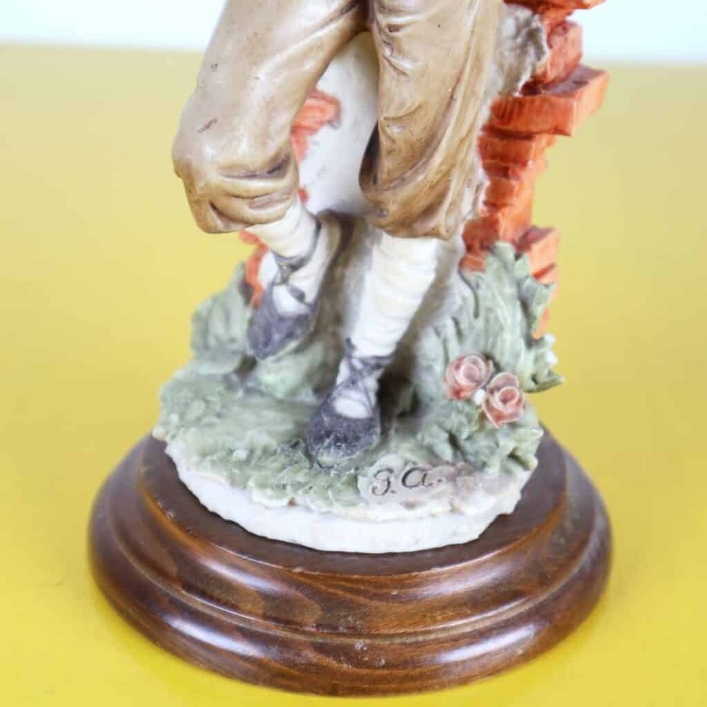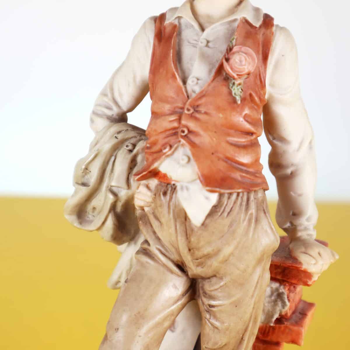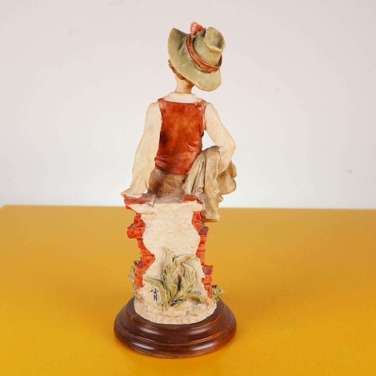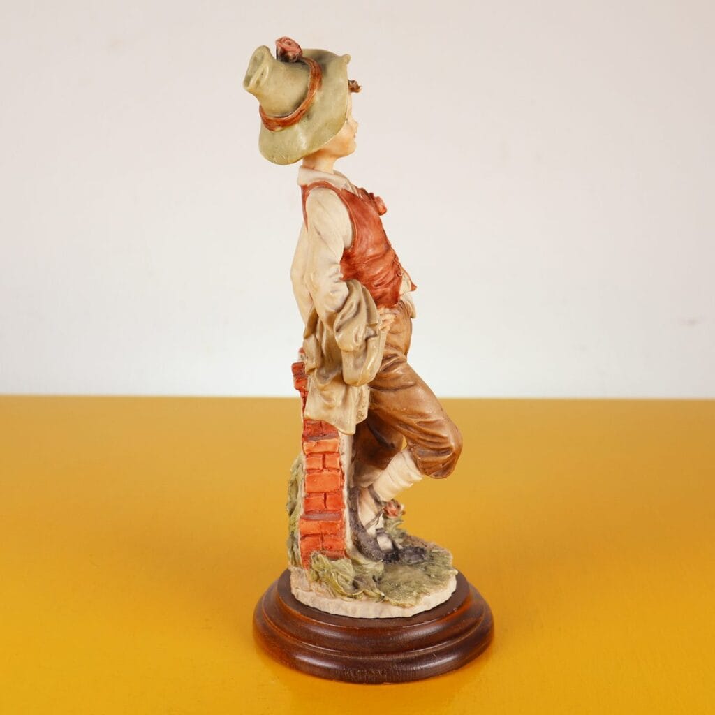 Questa affascinante statuetta di ceramica rappresenta un giovane contadino, vestito in abbigliamento tradizionale con giacca rossa e pantaloni marrone. La figura e' posata su una base circolare i... Questa affascinante statuetta di ceramica rappresenta un giovane contadino, vestito in abbigliamento tradizionale con giacca rossa e pantaloni marrone. La figura e' posata su una base circolare in legno pregiato, con dettagli curati e colorazioni tenui che mettono in evidenza la delicatezza dell'opera. Ottima per decorare ambienti rustici o classici, la statuetta e' un pezzo d'arte che racconta storie passate e si inserisce perfettamente in collezioni di antiquariato. Questa creazione artigianale e' in buone condizioni e puo' avere alcune lievi imperfezioni dovute all'usura del tempo, ma e' un oggetto da esporre per la sua bellezza e il suo fascino intramontabile. Altro