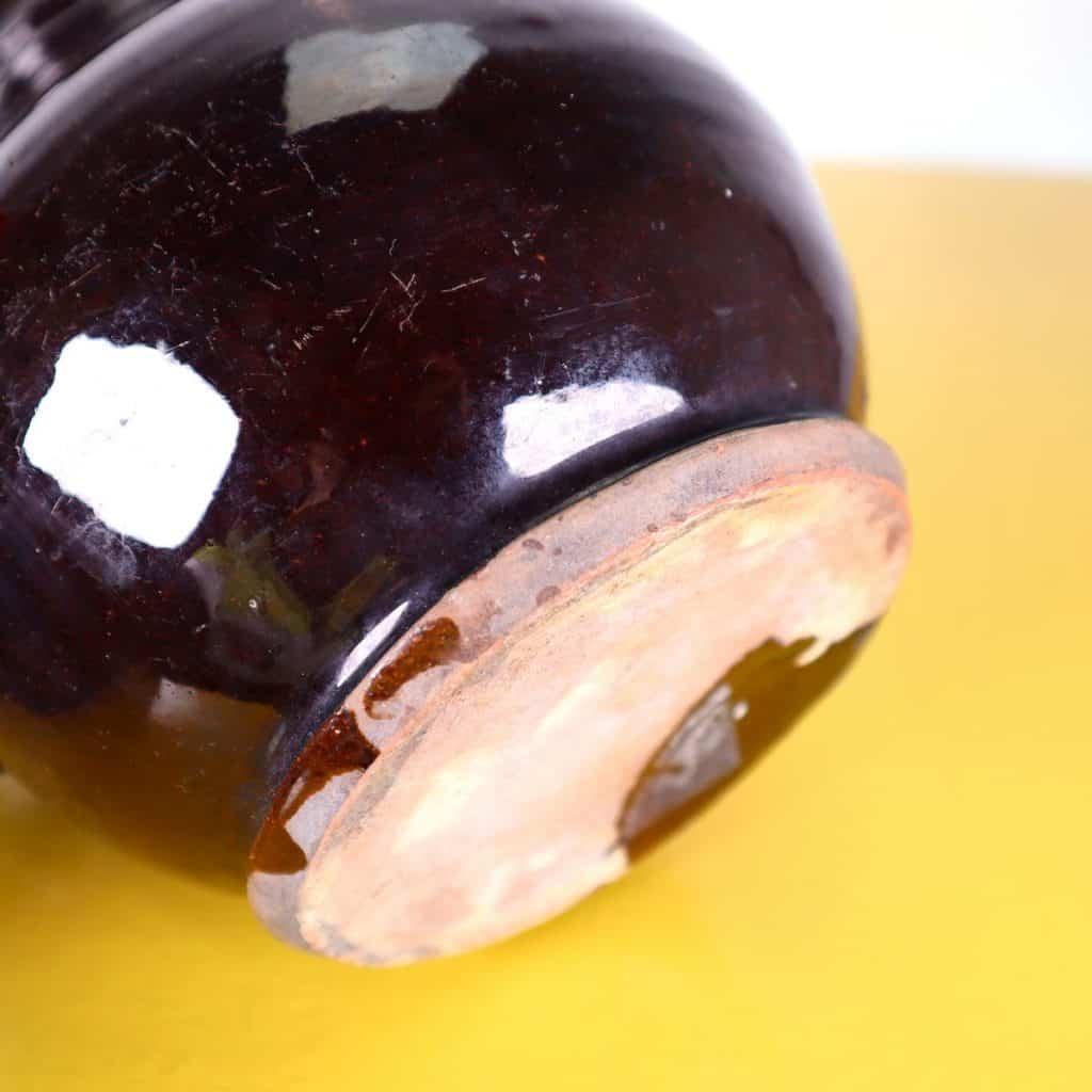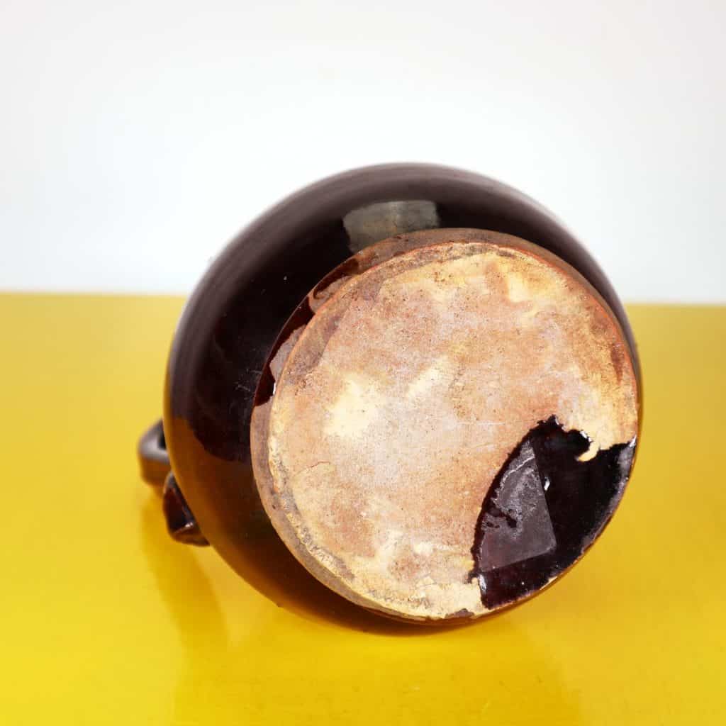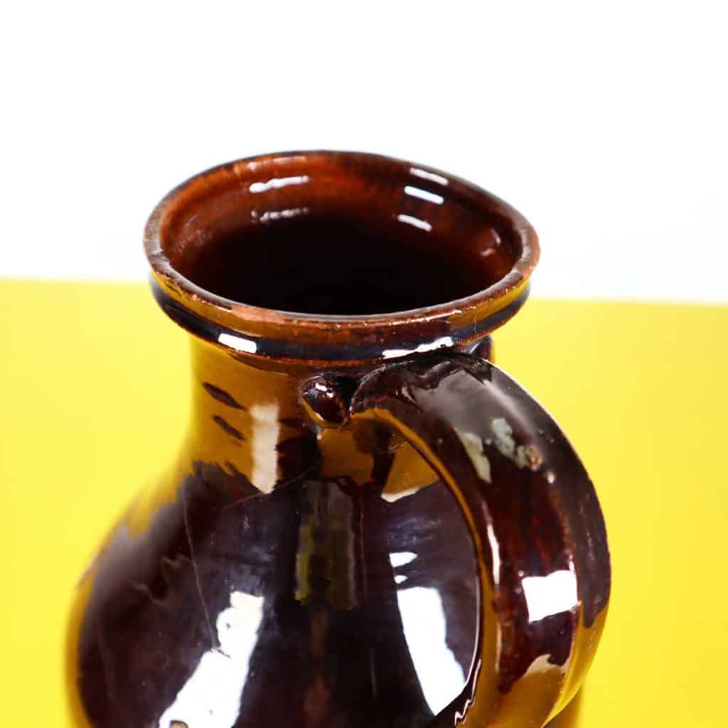 Questa raffinata brocca in terracotta smaltata e' un esempio pregevole di artigianato tradizionale. Caratterizzata da una forma generosa e due manici dal design distintivo, e' perfetta sia p... Questa raffinata brocca in terracotta smaltata e' un esempio pregevole di artigianato tradizionale. Caratterizzata da una forma generosa e due manici dal design distintivo, e' perfetta sia per l'uso quotidiano che come pezzo decorativo. La superficie lucida, di un intenso color bruno, e' accentuata da imperfezioni che raccontano la storia della sua lavorazione. Con un'altezza di circa 30 cm, puo' essere utilizzata come centrotavola o come semplice contenitore per fiori freschi. Questo oggetto affonda le radici in una tradizione artigianale che risale a un'epoca antecedente il 2010, pur mantenendo un'eleganza adatta a qualsiasi ambiente contemporaneo. Altro