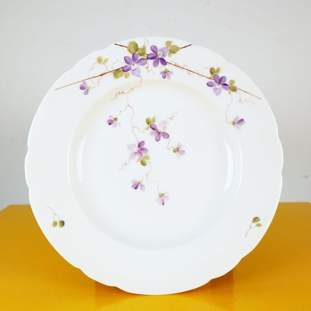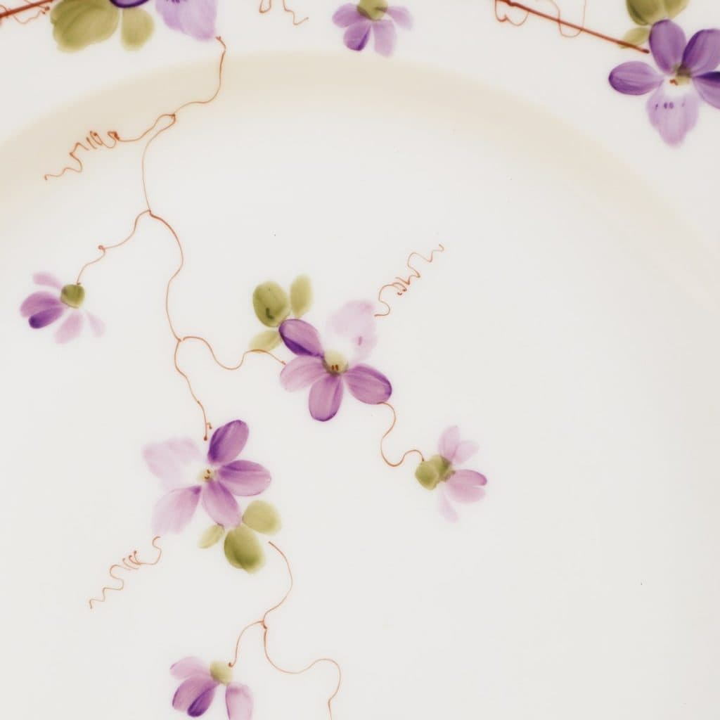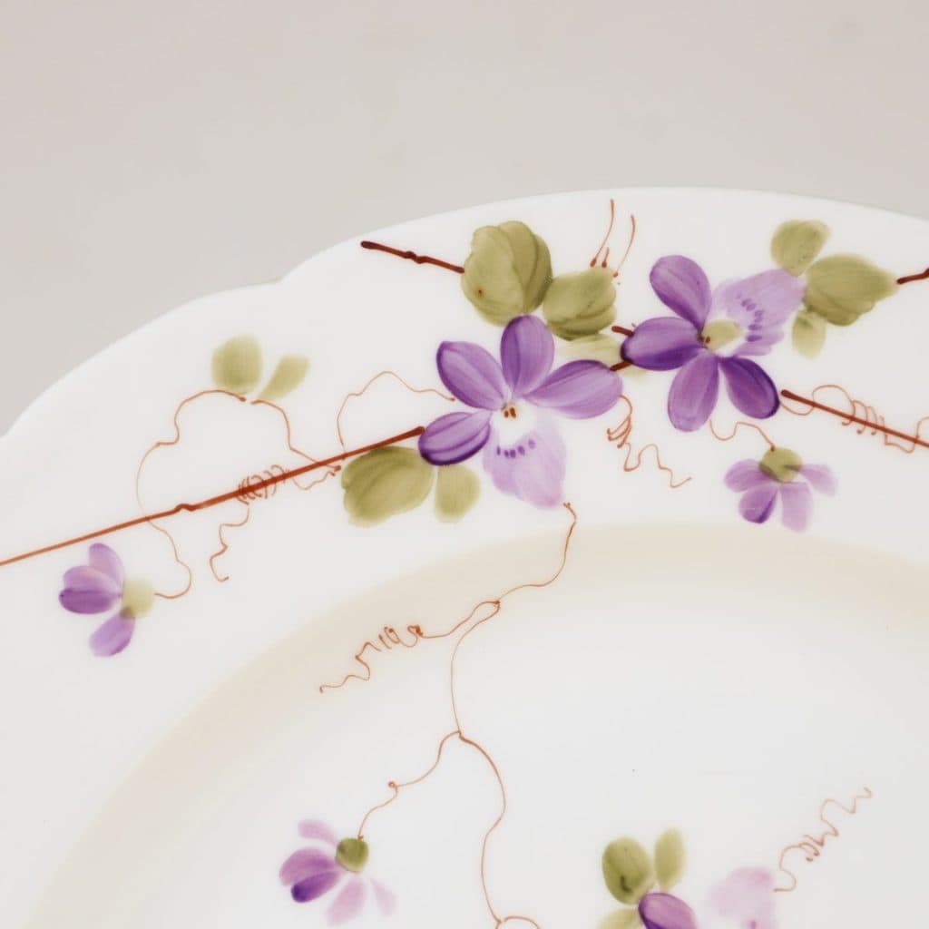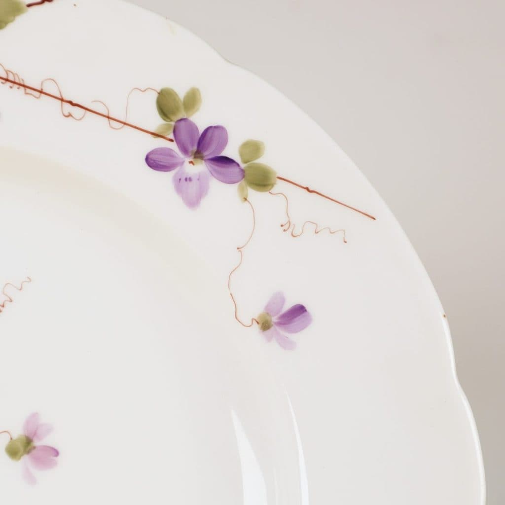 Questo splendido piatto in porcellana di Ginori rappresenta un esempio raffinato di artigianato artistico italiano. Decorato con un delicato motivo floreale, presenta violette in tonalita' di vio... Questo splendido piatto in porcellana di Ginori rappresenta un esempio raffinato di artigianato artistico italiano. Decorato con un delicato motivo floreale, presenta violette in tonalita' di viola e verde, elegantemente incorniciate da un filo di rame dorato. La forma del piatto, con bordi arrotondati, aggiunge un tocco di eleganza. Perfetto come pezzo decorativo, ma anche funzionale per servire i tuoi piatti preferiti, questo articolo unisce estetica e praticita'. Ideale per collezionisti e per chi ama un tocco di classe a tavola, il piatto e' in ottime condizioni, custodendo la sua bellezza originale. Altro