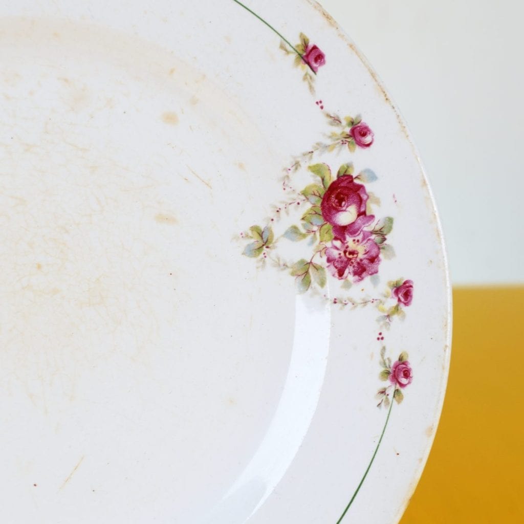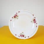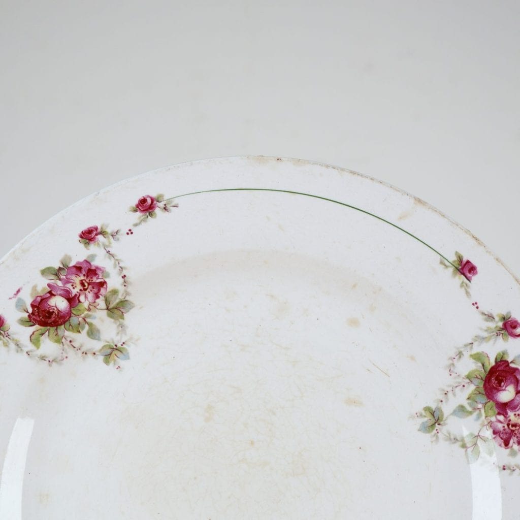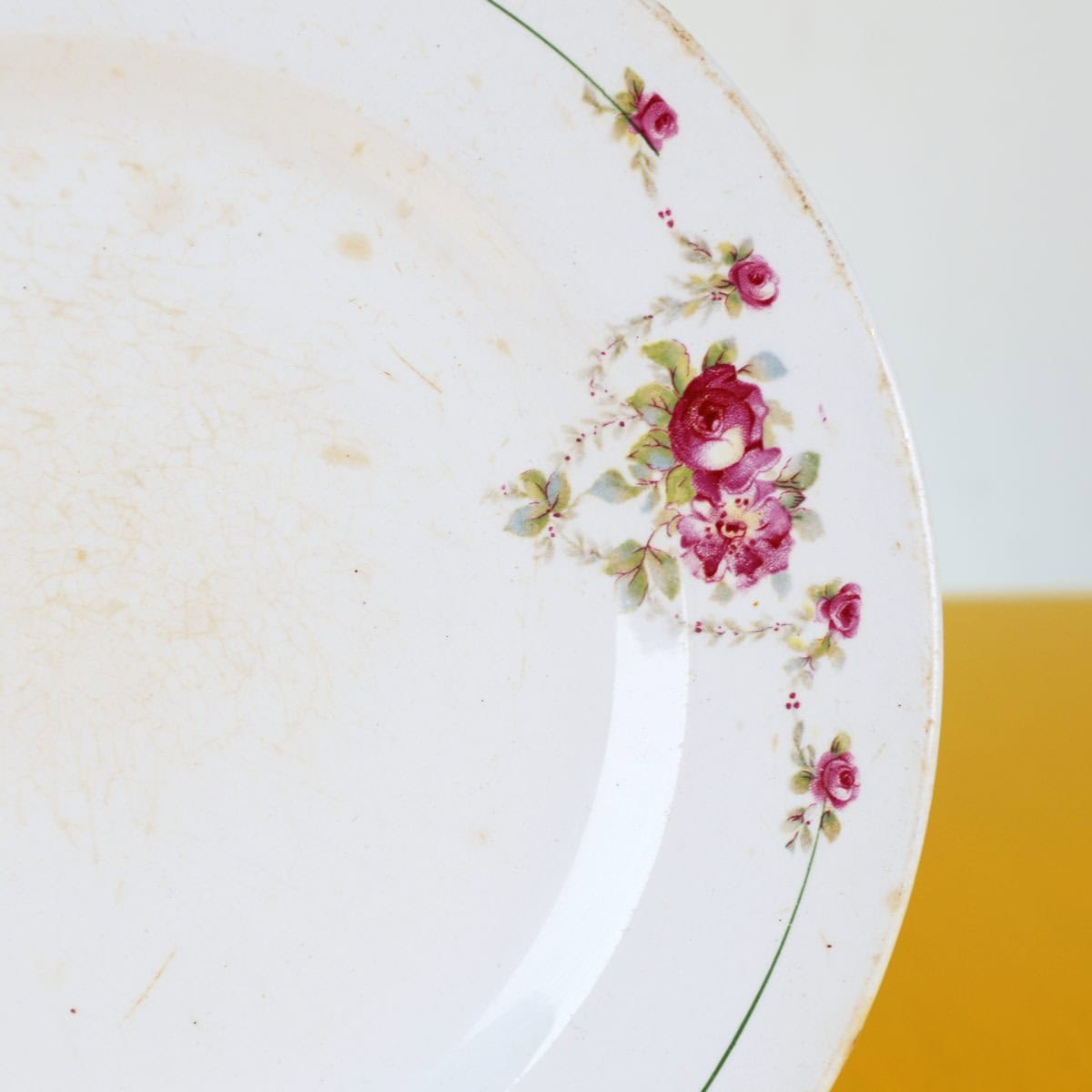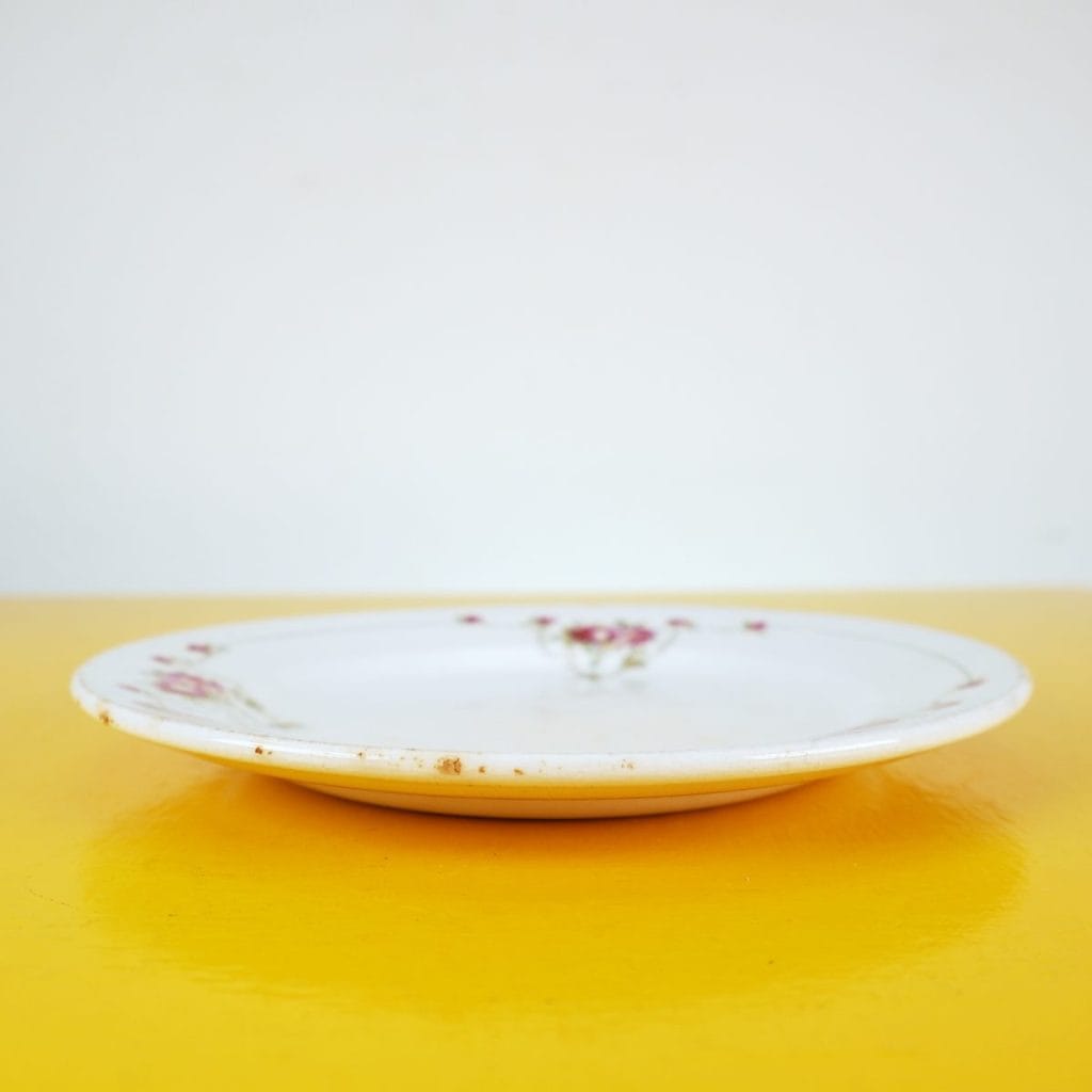 Scopri questo splendido piatto in ceramica vintage, ornato con delicate decorazioni floreali in tonalita' di rosa. Perfetto per aggiungere un tocco di eleganza alla tua tavola, questo pezzo e... Scopri questo splendido piatto in ceramica vintage, ornato con delicate decorazioni floreali in tonalita' di rosa. Perfetto per aggiungere un tocco di eleganza alla tua tavola, questo pezzo e' databile presumibilmente agli inizi del XX secolo. Presenta segni di usura che conferiscono al piatto un fascino autentico e vintage. Ideale per l'uso quotidiano o come elemento decorativo da esposizione in una vetrina. Nonostante alcuni aloni e piccoli graffi, le decorazioni rimangono luminose e affascinanti, rendendolo un oggetto unico per gli amanti del design e delle cose belle. Altro