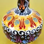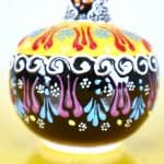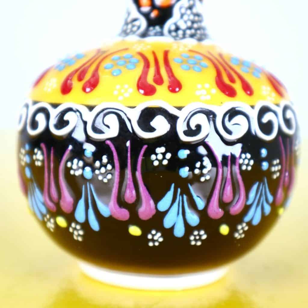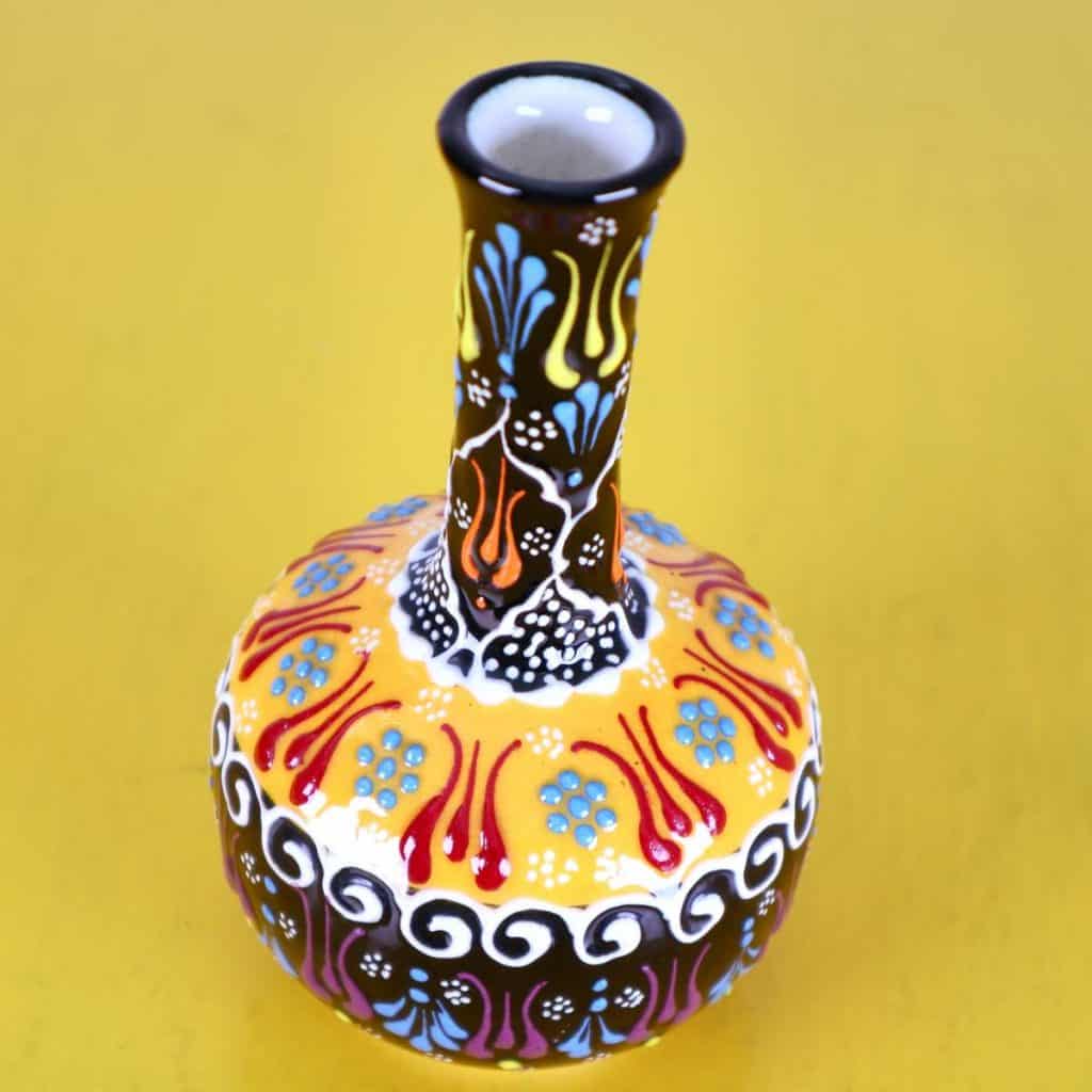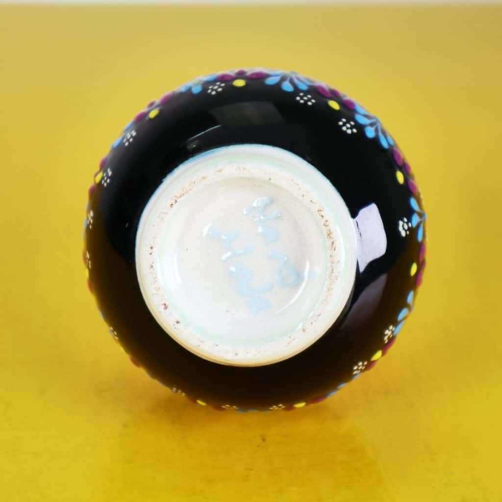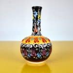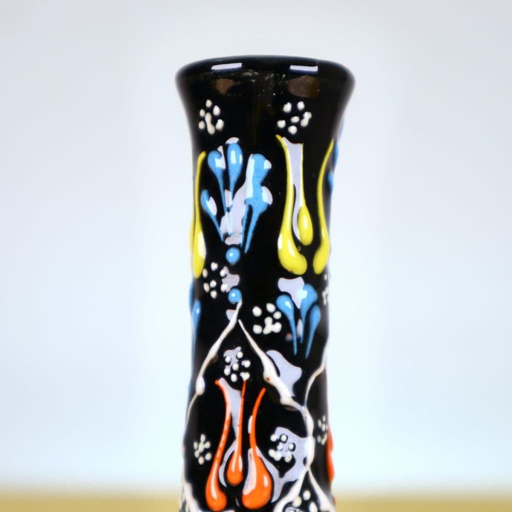 Vaso in ceramica smaltata e decorata a mano, caratterizzato da una ricca policromia su fondo scuro con motivi floreali e ornamentali di forte impatto visivo. La forma elegante con collo slanciato lo r... Vaso in ceramica smaltata e decorata a mano, caratterizzato da una ricca policromia su fondo scuro con motivi floreali e ornamentali di forte impatto visivo. La forma elegante con collo slanciato lo rende un pezzo decorativo scenografico, ideale come punto focale per interni dal gusto eclettico o boho. Altro