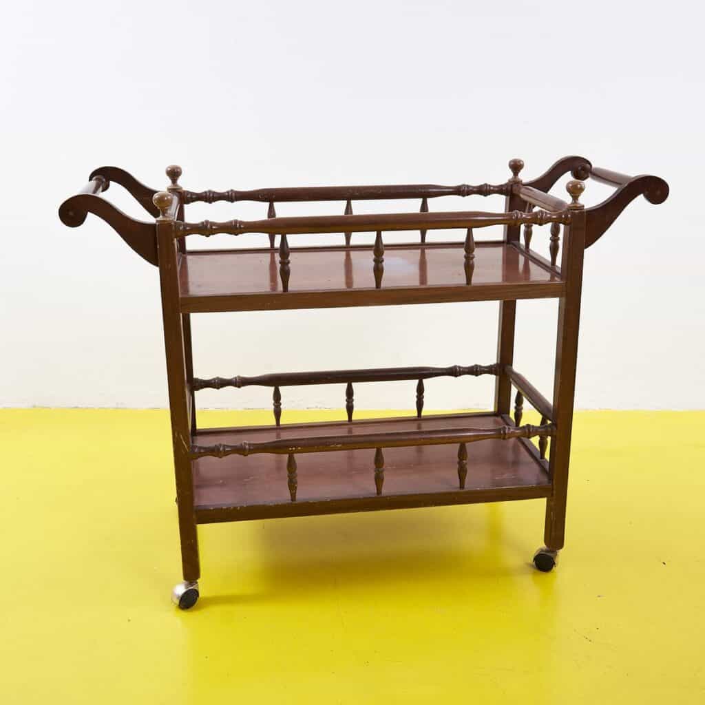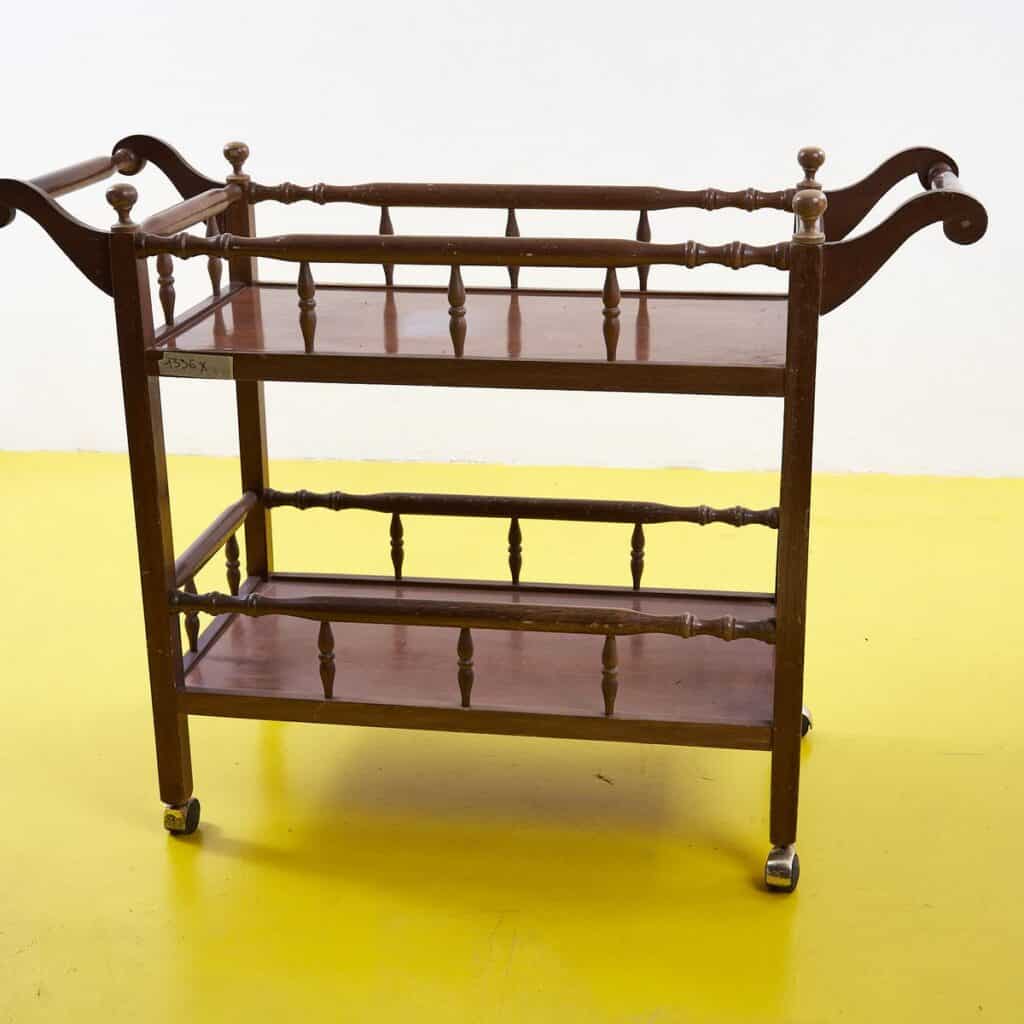 Questo affascinante carrello da servizio e' un perfetto esempio di design vintage, combinando eleganza e praticita'. Realizzato in legno massello, presenta due ripiani spaziosi ideali per se... Questo affascinante carrello da servizio e' un perfetto esempio di design vintage, combinando eleganza e praticita'. Realizzato in legno massello, presenta due ripiani spaziosi ideali per servire bevande o snack durante i tuoi eventi. Le maniglie curve e le gambe dotate di rotelle conferiscono un tocco di classe, rendendolo facile da spostare. La finitura calda del legno si integra in qualsiasi ambiente, dal rustico al moderno. Aggiungi un pezzo di storia alla tua casa con questo carrello che unisce estetica e funzionalita' in modo impeccabile. Altro