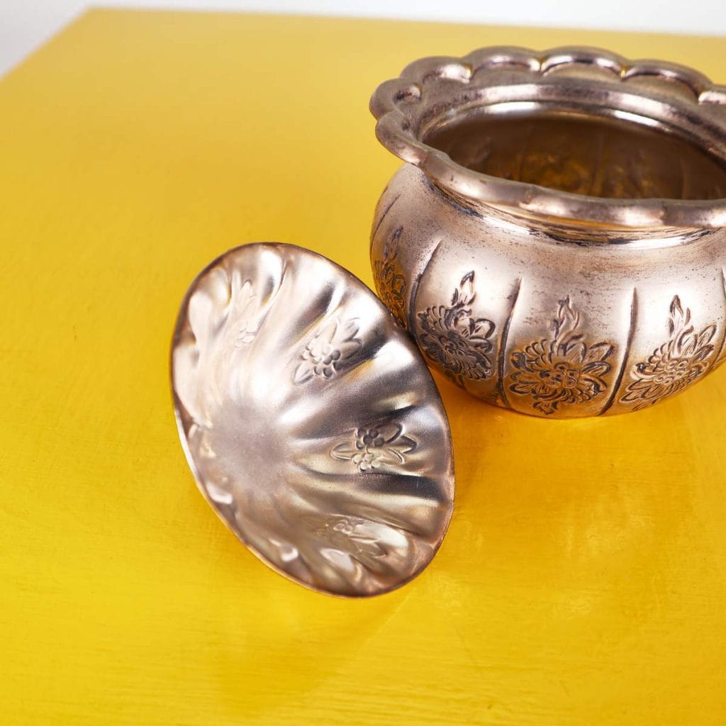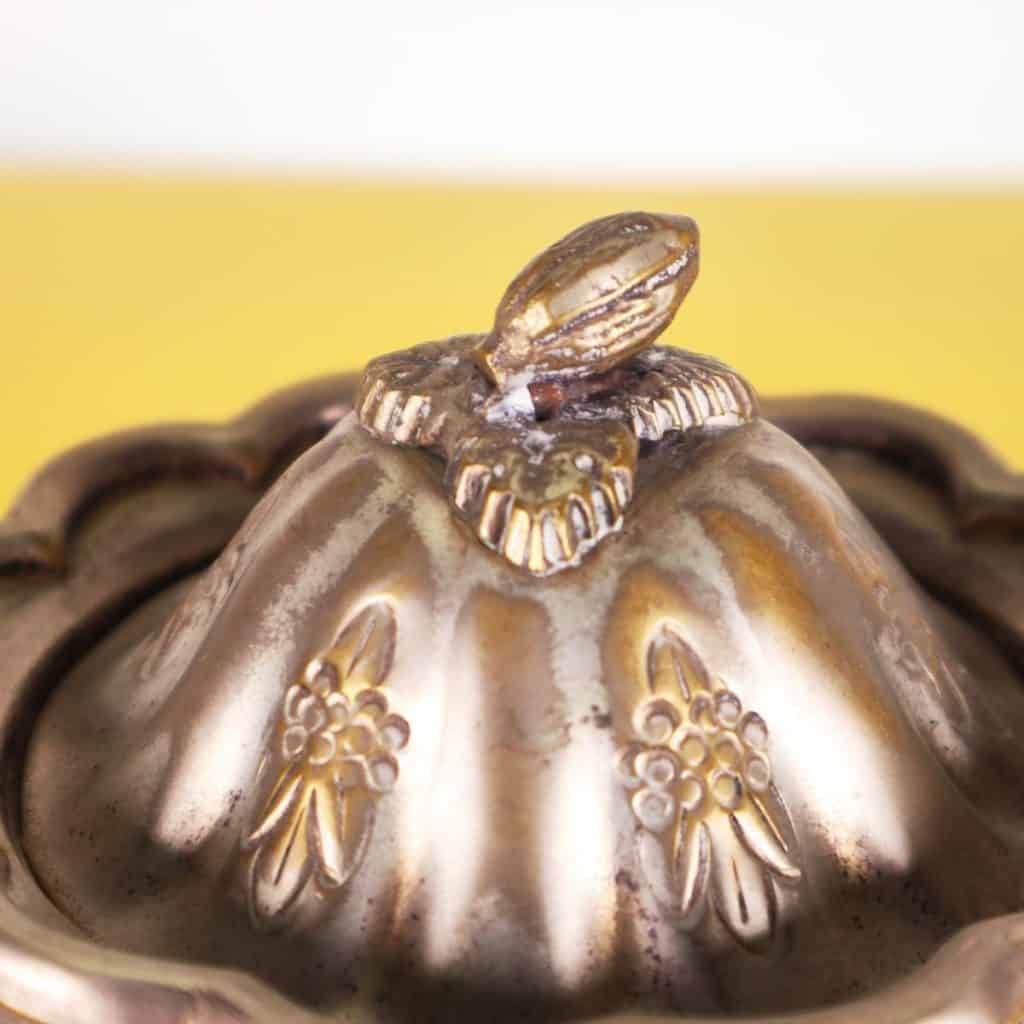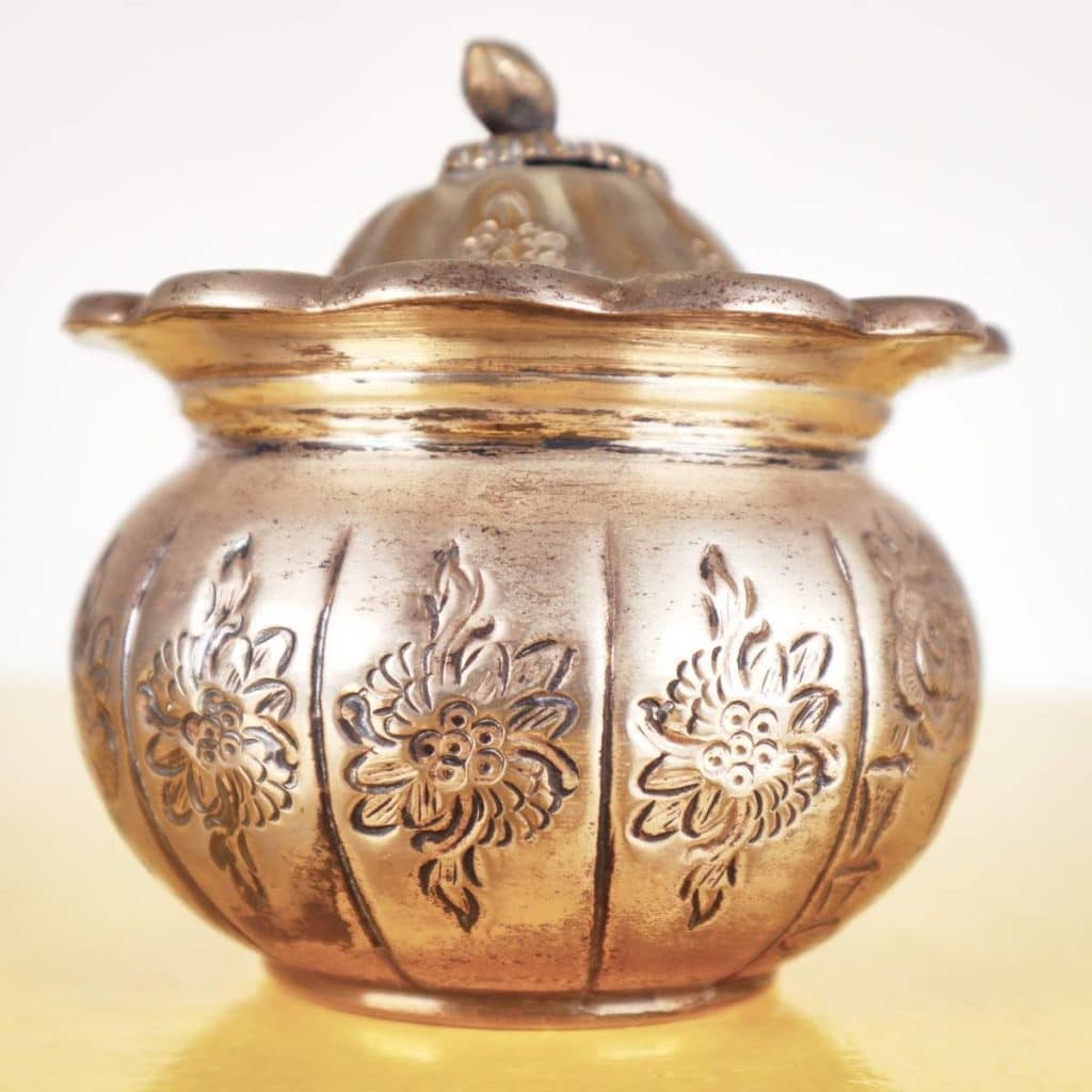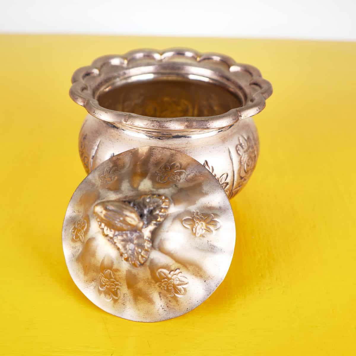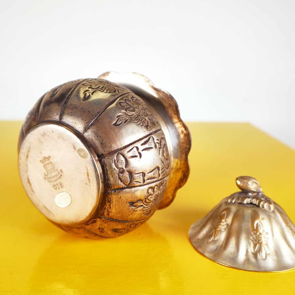 Scopri questo raffinato contenitore decorativo, esempi di eccellenza artigianale della Jordan Sheffield Collection. Realizzato in metallo, presenta una superficie dorata con intricati motivi floreali ... Scopri questo raffinato contenitore decorativo, esempi di eccellenza artigianale della Jordan Sheffield Collection. Realizzato in metallo, presenta una superficie dorata con intricati motivi floreali incisi e una chiusura a forma di bocciolo. La forma rotonda e il coperchio ondulato lo rendono un pezzo distintivo perfetto per abbellire qualsiasi ambiente. Ideale per conservare piccoli oggetti, caramelle o come elegante elemento decorativo su un tavolo o una mensola. La sua bellezza senza tempo si sposa bene con vari stili di arredamento, dal classico al contemporaneo. Altro
