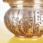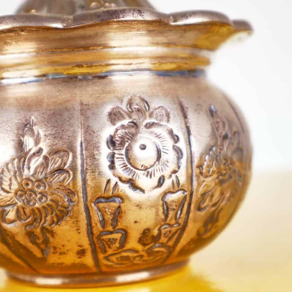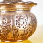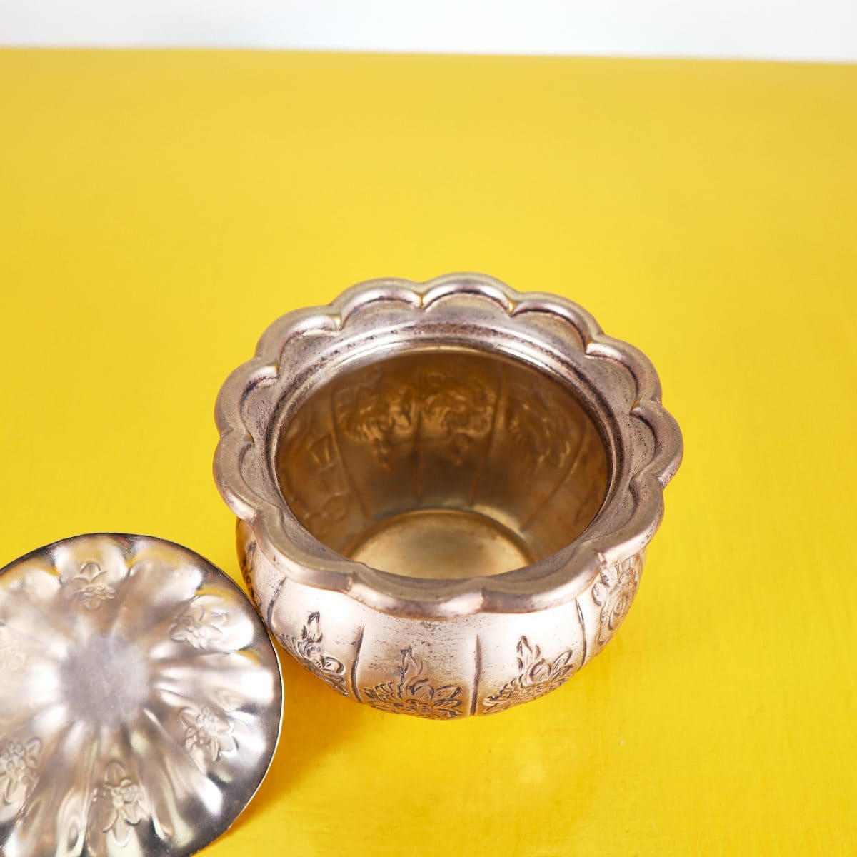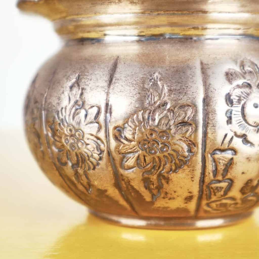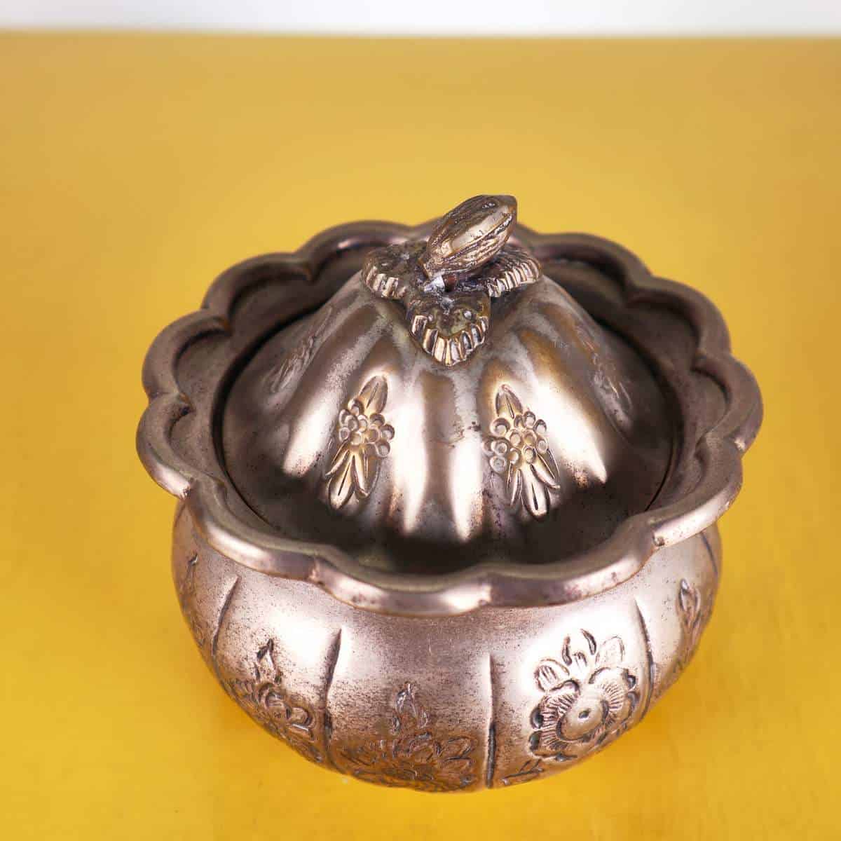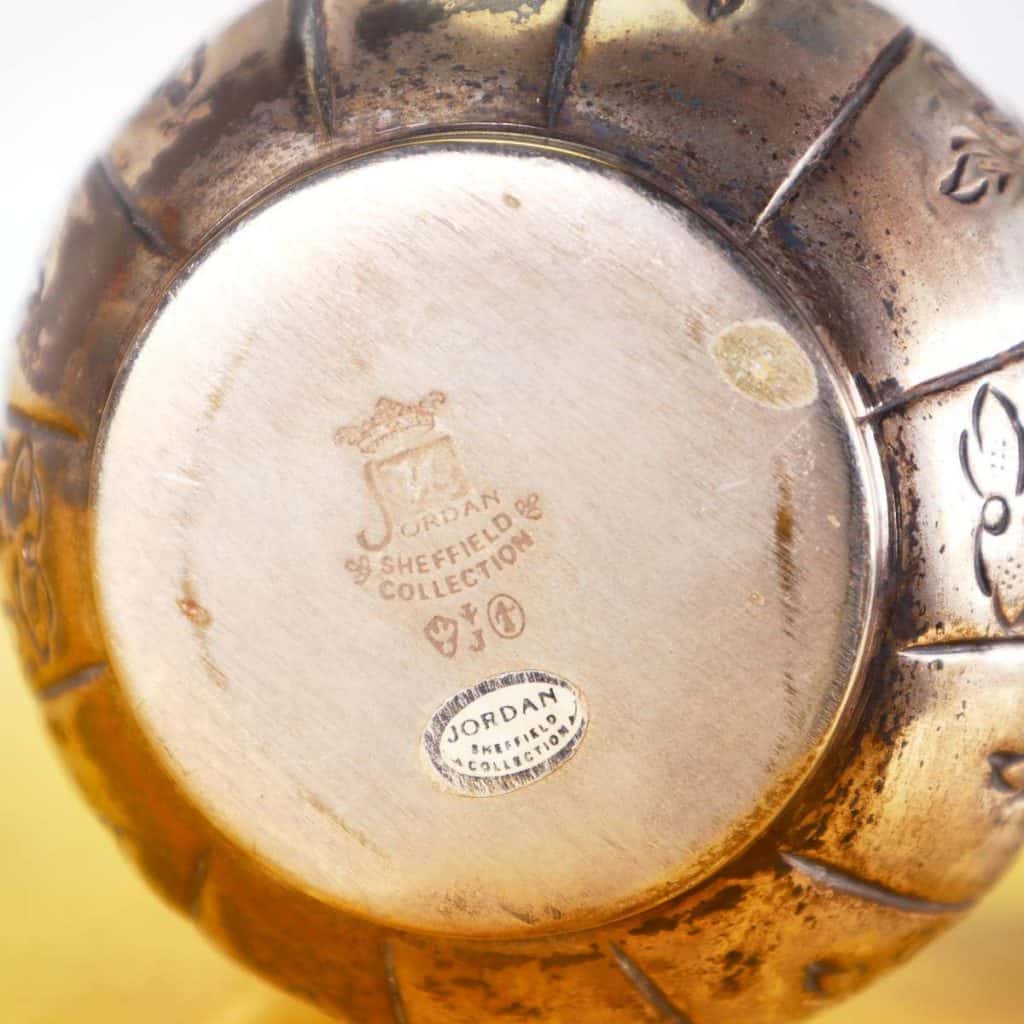 Scopri questo raffinato contenitore decorativo, esempi di eccellenza artigianale della Jordan Sheffield Collection. Realizzato in metallo, presenta una superficie dorata con intricati motivi floreali ... Scopri questo raffinato contenitore decorativo, esempi di eccellenza artigianale della Jordan Sheffield Collection. Realizzato in metallo, presenta una superficie dorata con intricati motivi floreali incisi e una chiusura a forma di bocciolo. La forma rotonda e il coperchio ondulato lo rendono un pezzo distintivo perfetto per abbellire qualsiasi ambiente. Ideale per conservare piccoli oggetti, caramelle o come elegante elemento decorativo su un tavolo o una mensola. La sua bellezza senza tempo si sposa bene con vari stili di arredamento, dal classico al contemporaneo. Altro