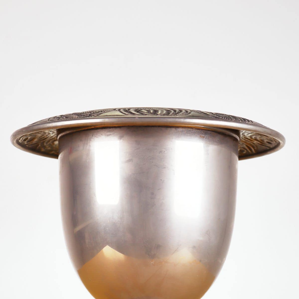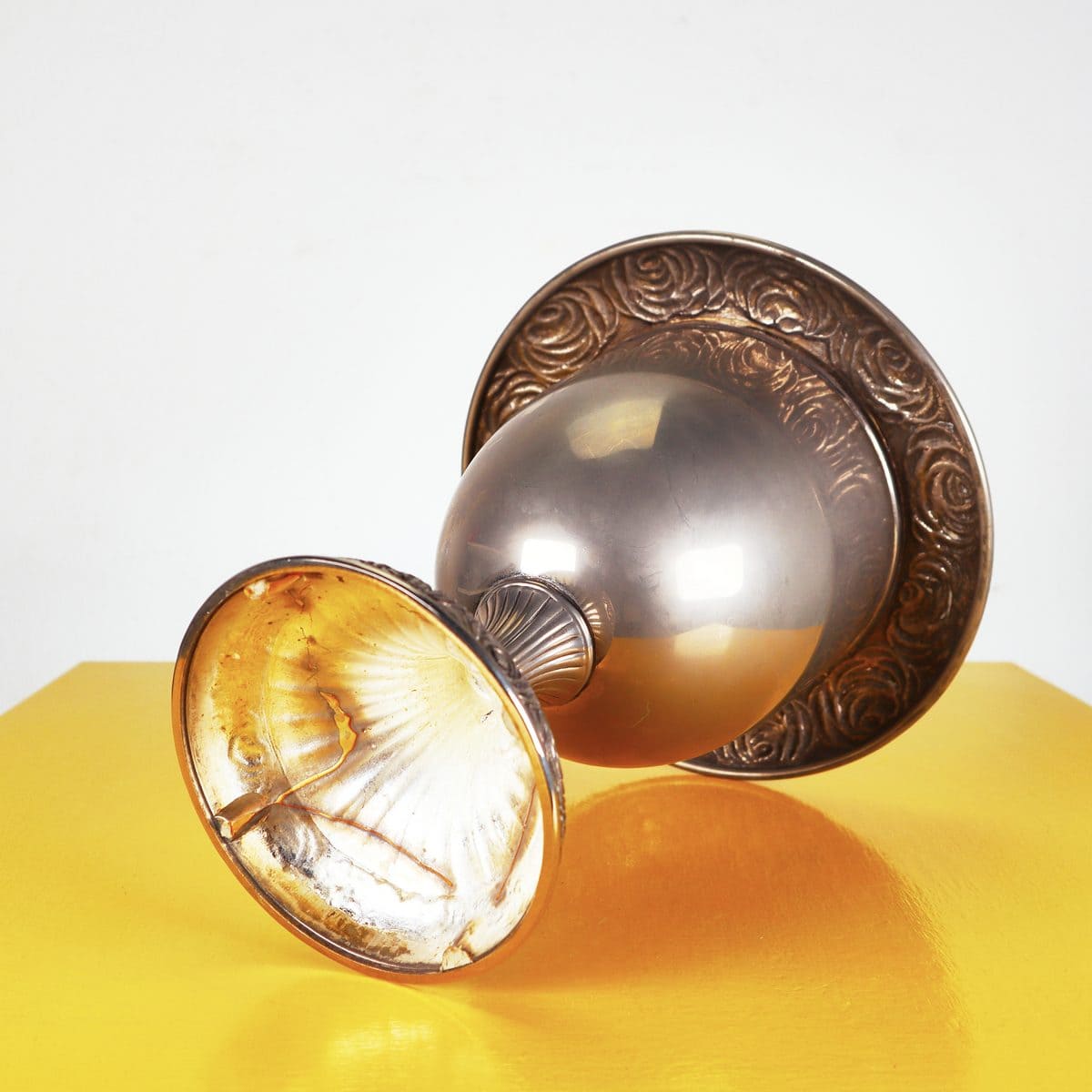 Questa affascinante coppa in metallo, con un design raffinato e dettagli decorativi, e' un pezzo unico di design artistico. Caratterizzata da una base lavorata con ornamenti floreali e un corpo l... Questa affascinante coppa in metallo, con un design raffinato e dettagli decorativi, e' un pezzo unico di design artistico. Caratterizzata da una base lavorata con ornamenti floreali e un corpo lucido che riflette la luce in maniera incantevole. Perfetta per eventi speciali, come matrimoni o feste, o come elemento decorativo in casa per aggiungere un tocco di eleganza. La coppa e' realizzata in metallo di alta qualita', garantendo durata e resistenza. Presenta alcune lievi imperfezioni sfortunate che ne attestano la storia, rendendola ancora piu' preziosa. Ideale per esposizioni o come centro tavola. Altro