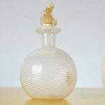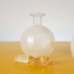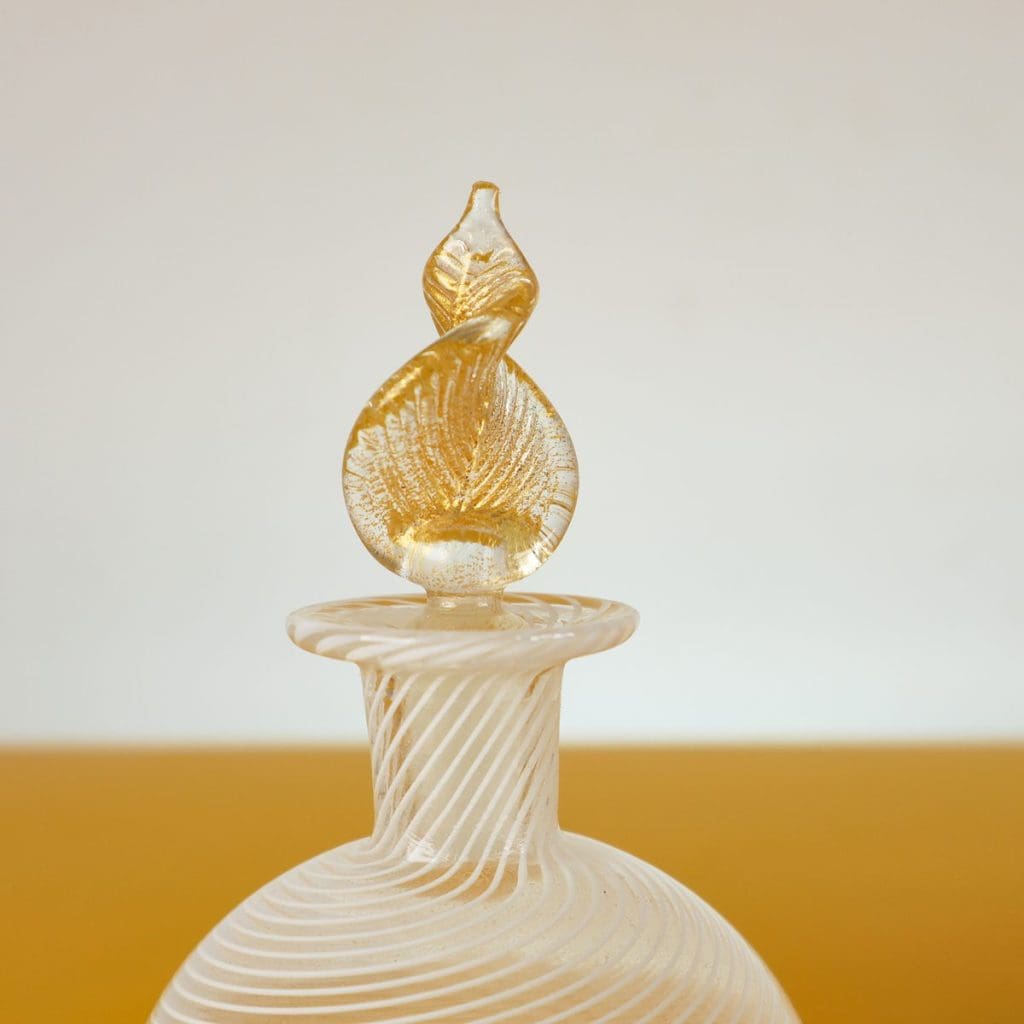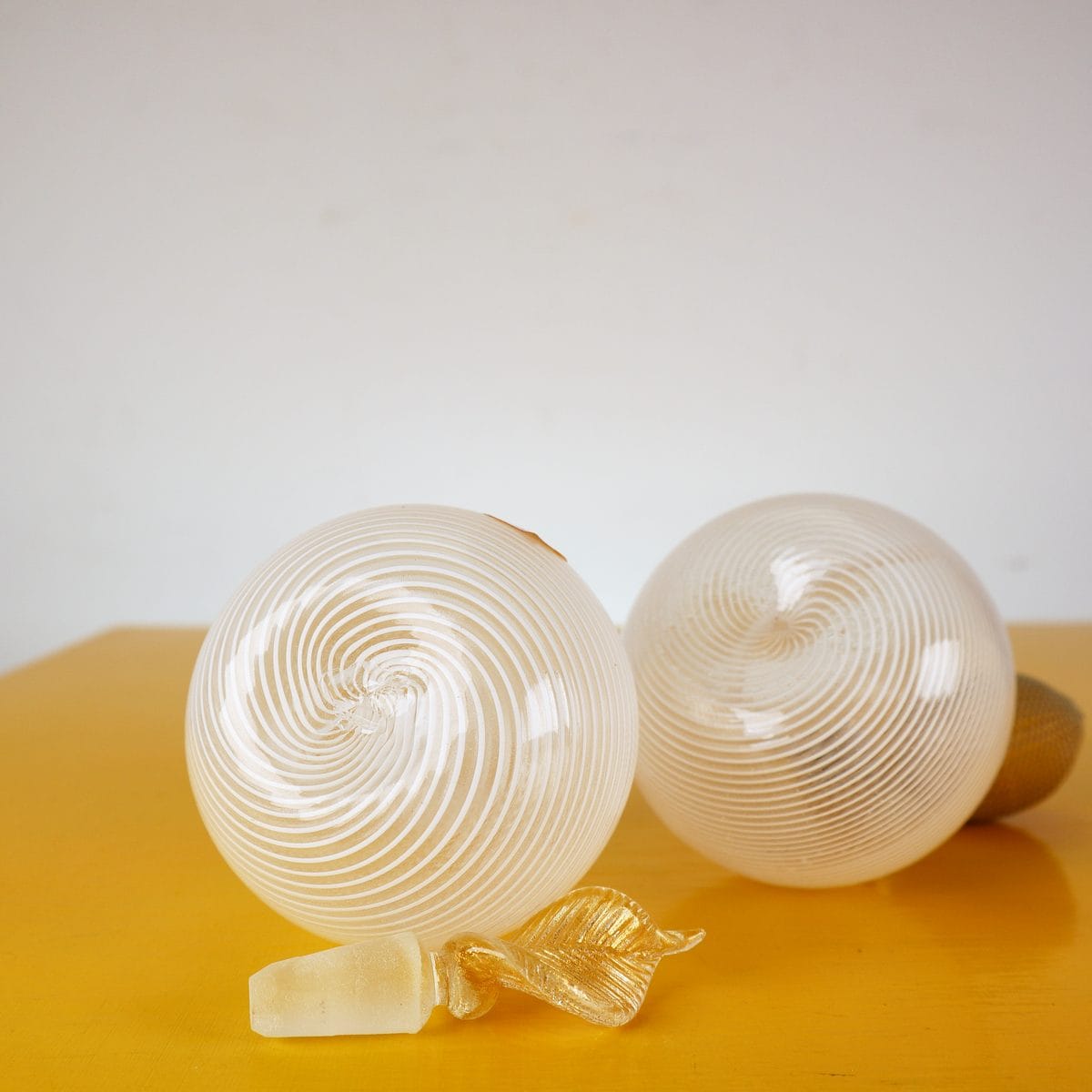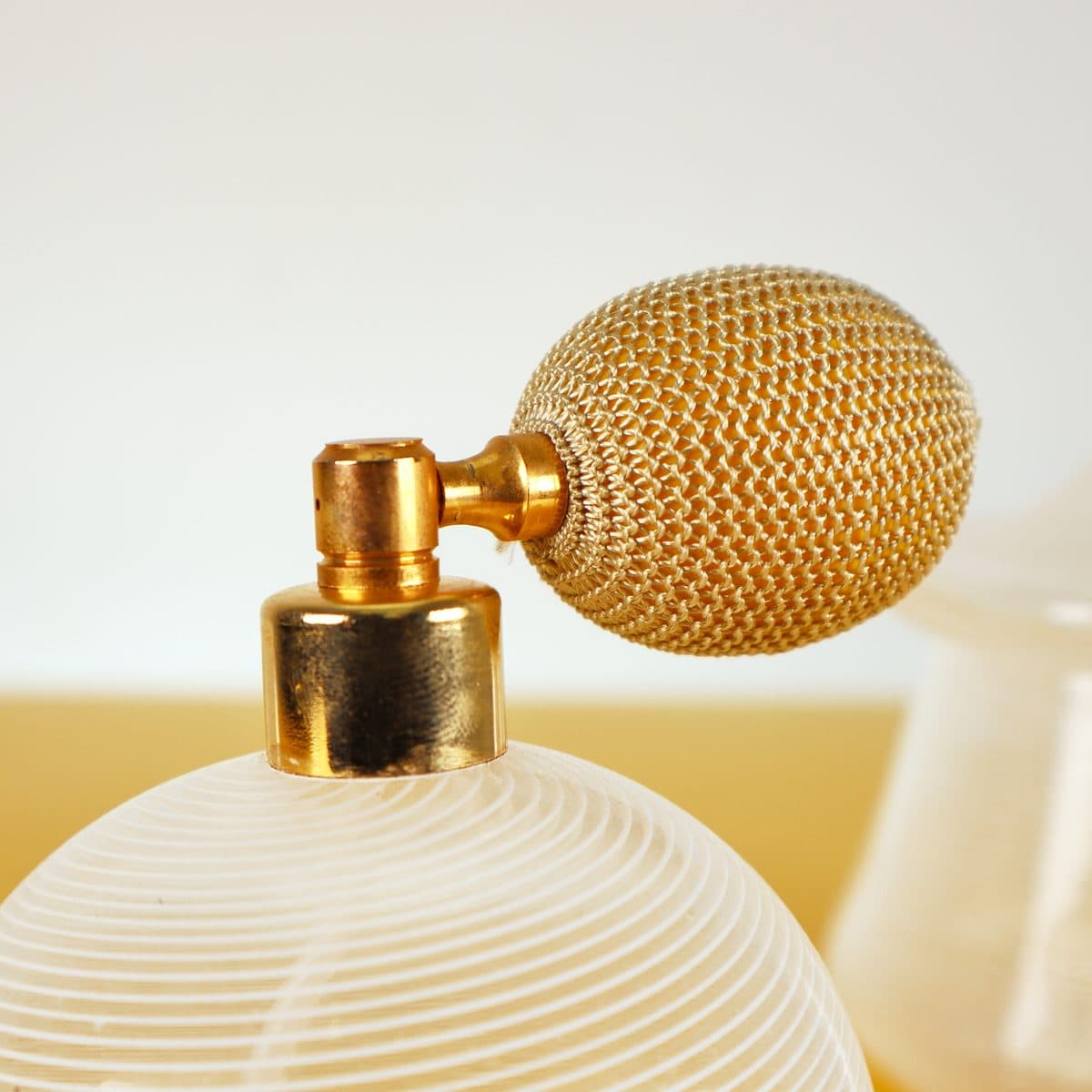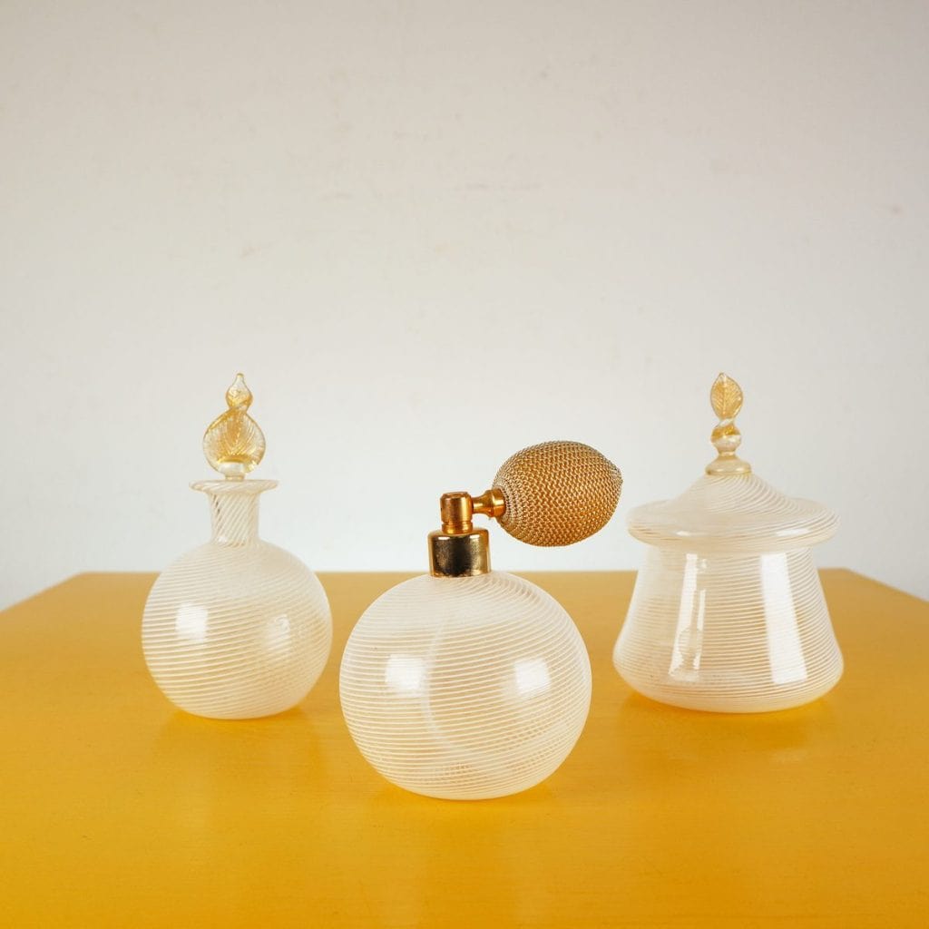 Questo raffinato set di profumatori in vetro di Murano representa un perfetto esempio di artigianato italiano. Composto da tre pezzi, ciascun profumatore presenta una finitura trasparente con delicate... Questo raffinato set di profumatori in vetro di Murano representa un perfetto esempio di artigianato italiano. Composto da tre pezzi, ciascun profumatore presenta una finitura trasparente con delicate striature, capaci di riflettere la luce in modo incantevole. Il design include un elegante spruzzatore dorato, mentre le chiusure floreali in vetro aggiungono un tocco di classe. Le forme armoniose e i dettagli curati rendono questo set ideale per decorare un tavolino o per essere utilizzato come oggetto d'arte. Perfetto per chi ama l'eleganza e desidera arricchire la propria casa con pezzi unici e storici. Altro