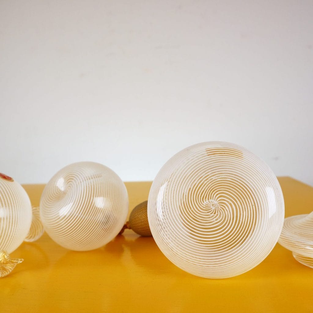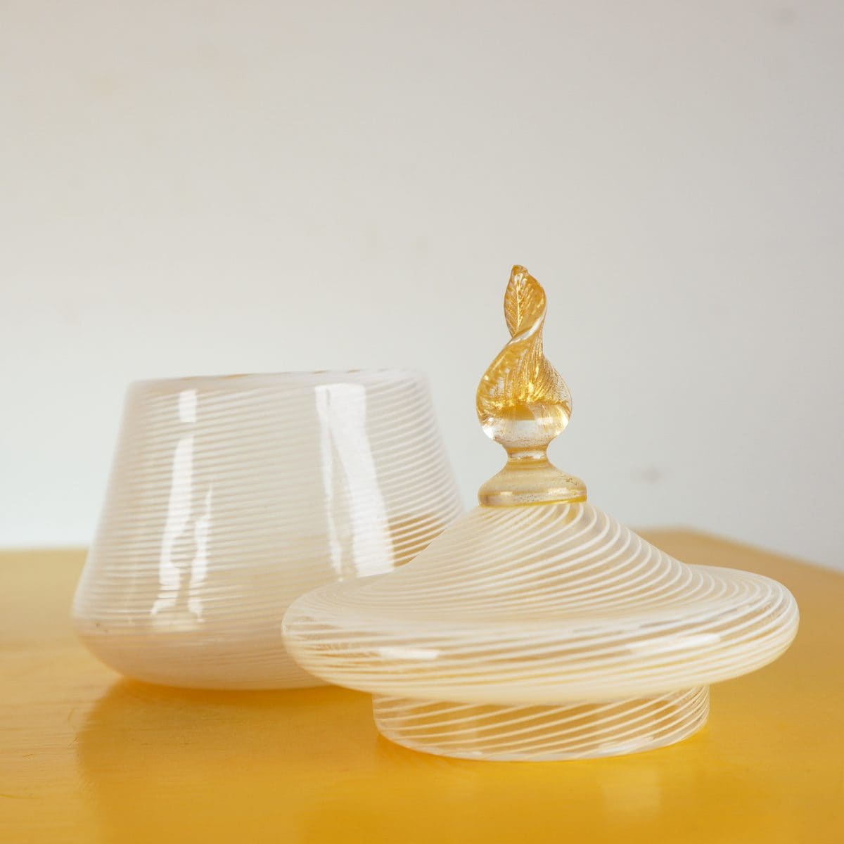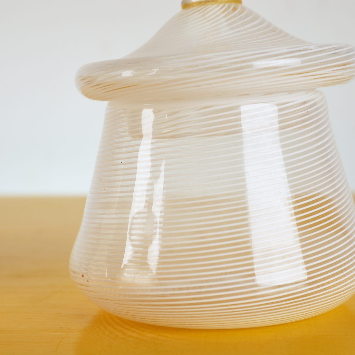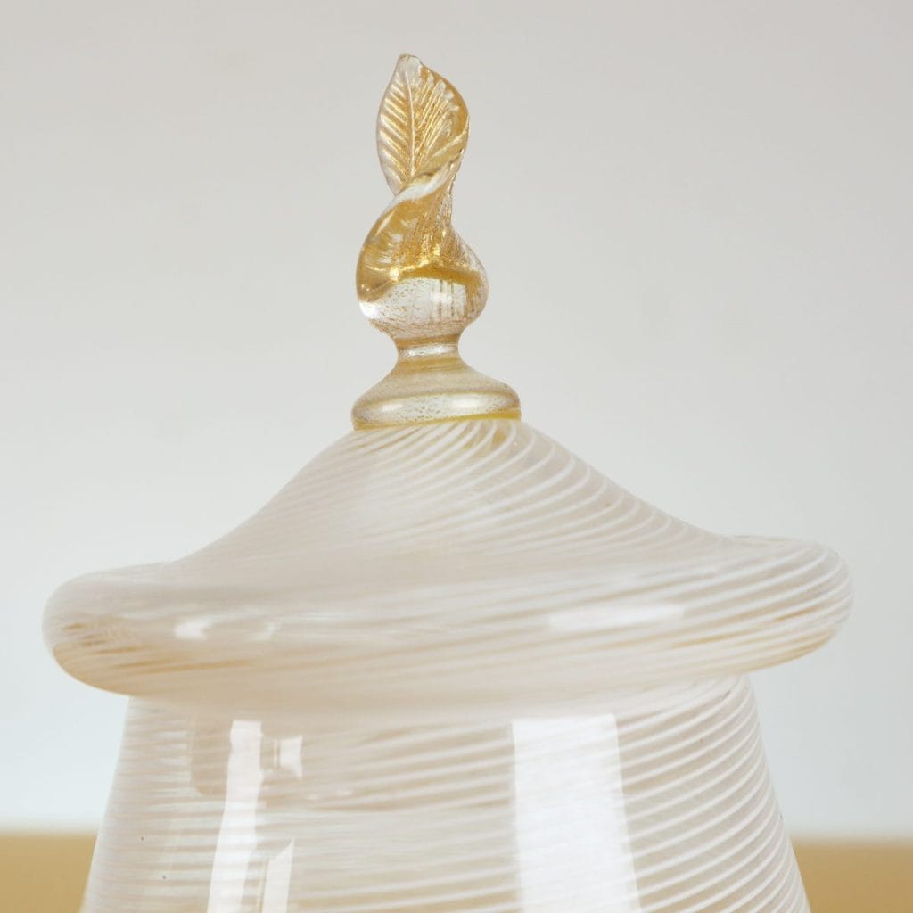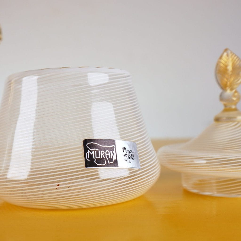Questo raffinato set di profumatori in vetro di Murano representa un perfetto esempio di artigianato italiano. Composto da tre pezzi, ciascun profumatore presenta una finitura trasparente con delicate... Questo raffinato set di profumatori in vetro di Murano representa un perfetto esempio di artigianato italiano. Composto da tre pezzi, ciascun profumatore presenta una finitura trasparente con delicate striature, capaci di riflettere la luce in modo incantevole. Il design include un elegante spruzzatore dorato, mentre le chiusure floreali in vetro aggiungono un tocco di classe. Le forme armoniose e i dettagli curati rendono questo set ideale per decorare un tavolino o per essere utilizzato come oggetto d'arte. Perfetto per chi ama l'eleganza e desidera arricchire la propria casa con pezzi unici e storici. Altro