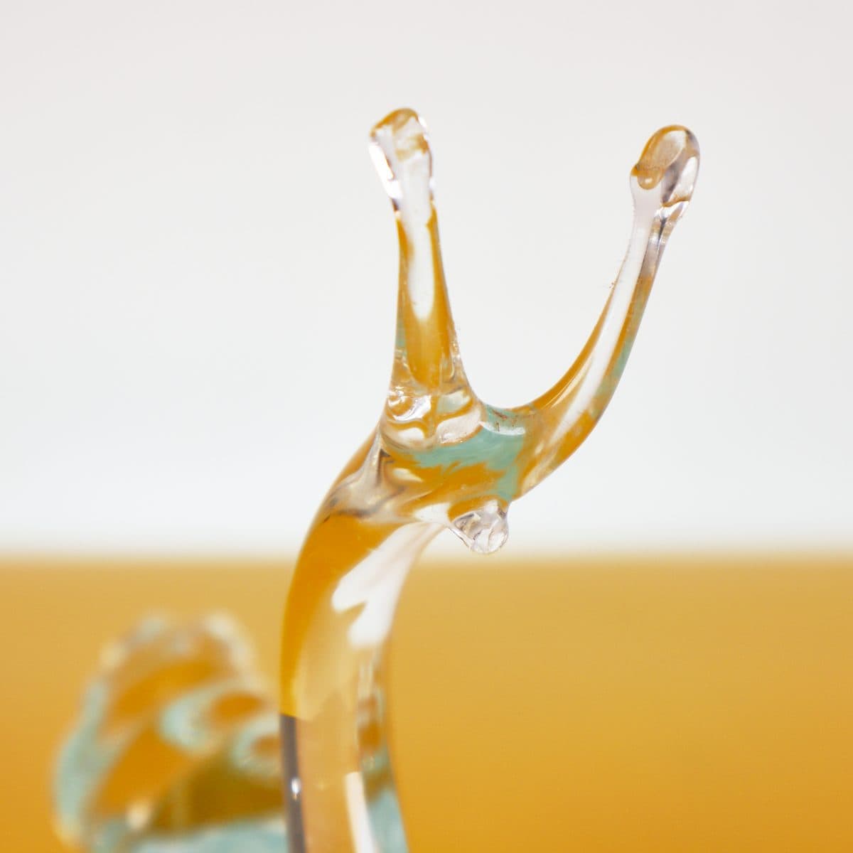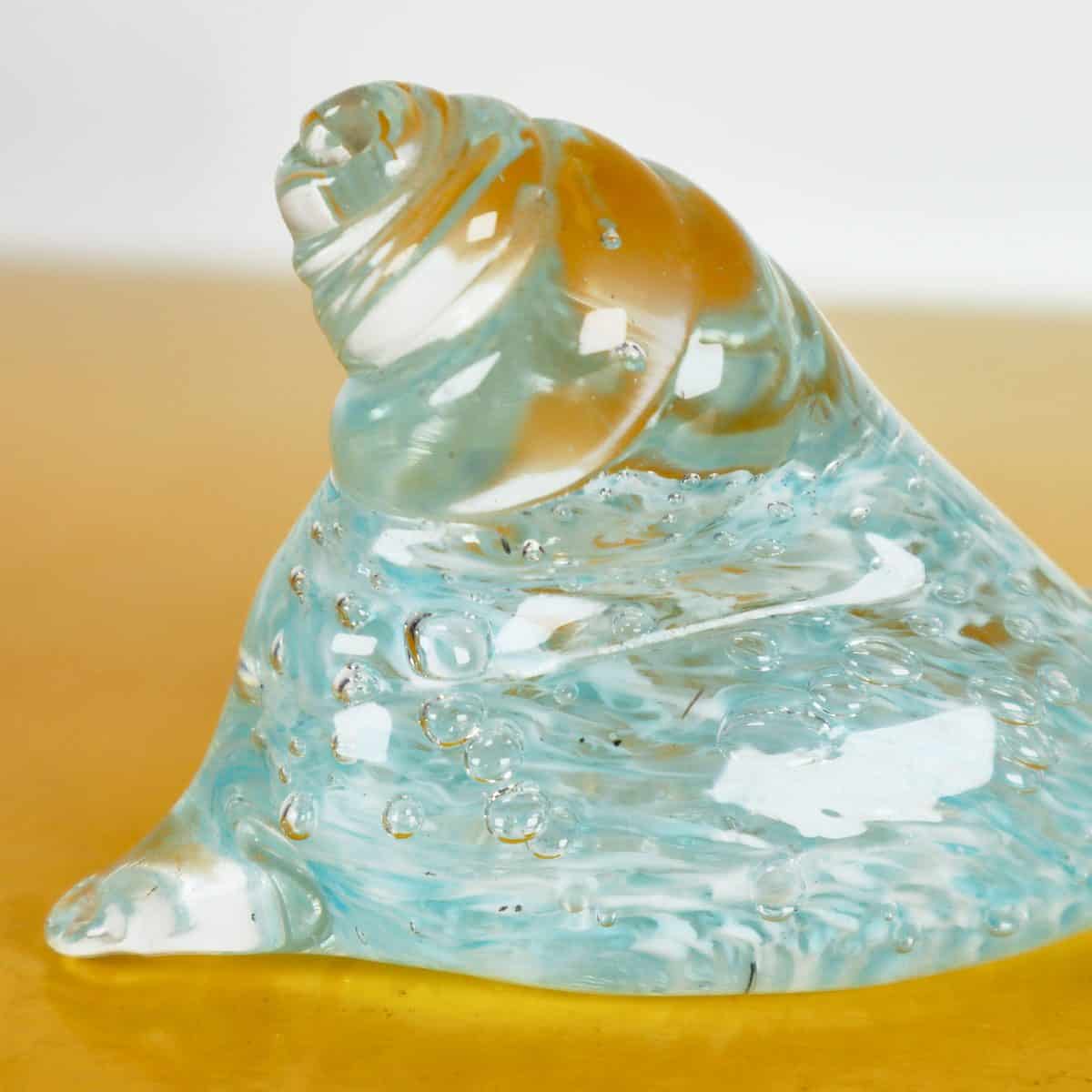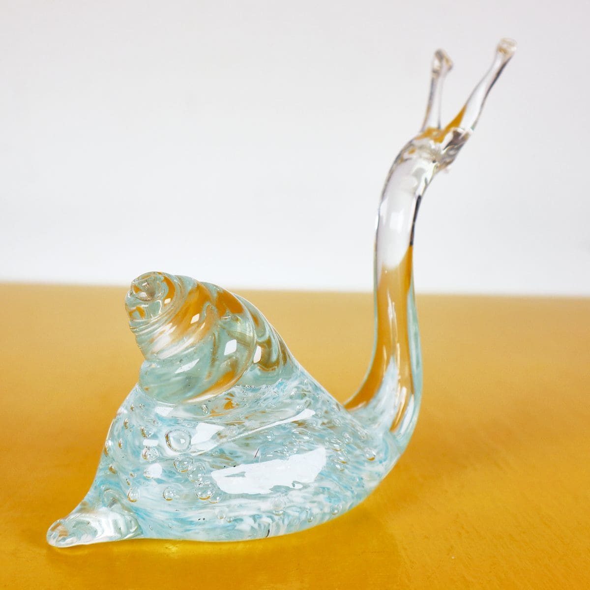 Questa affascinante scultura rappresenta una lumaca in vetro di Murano, realizzata con una sapiente tecnica di lavorazione. La lumaca presenta un corpo trasparente con riflessi blu e pagliuzze dorate,... Questa affascinante scultura rappresenta una lumaca in vetro di Murano, realizzata con una sapiente tecnica di lavorazione. La lumaca presenta un corpo trasparente con riflessi blu e pagliuzze dorate, creando un effetto luminoso unico. Perfetta per adornare qualsiasi superficie, puo' essere utilizzata anche come oggetto decorativo in vetrine o su mensole. Il design elegante e curato nei dettagli rende questo pezzo un'aggiunta raffinata per collezionisti di arte in vetro o per amanti del design. Nonostante la sua delicatezza, la scultura e' in ottime condizioni, pronta a diventare il punto focale di qualsiasi ambiente. Altro
