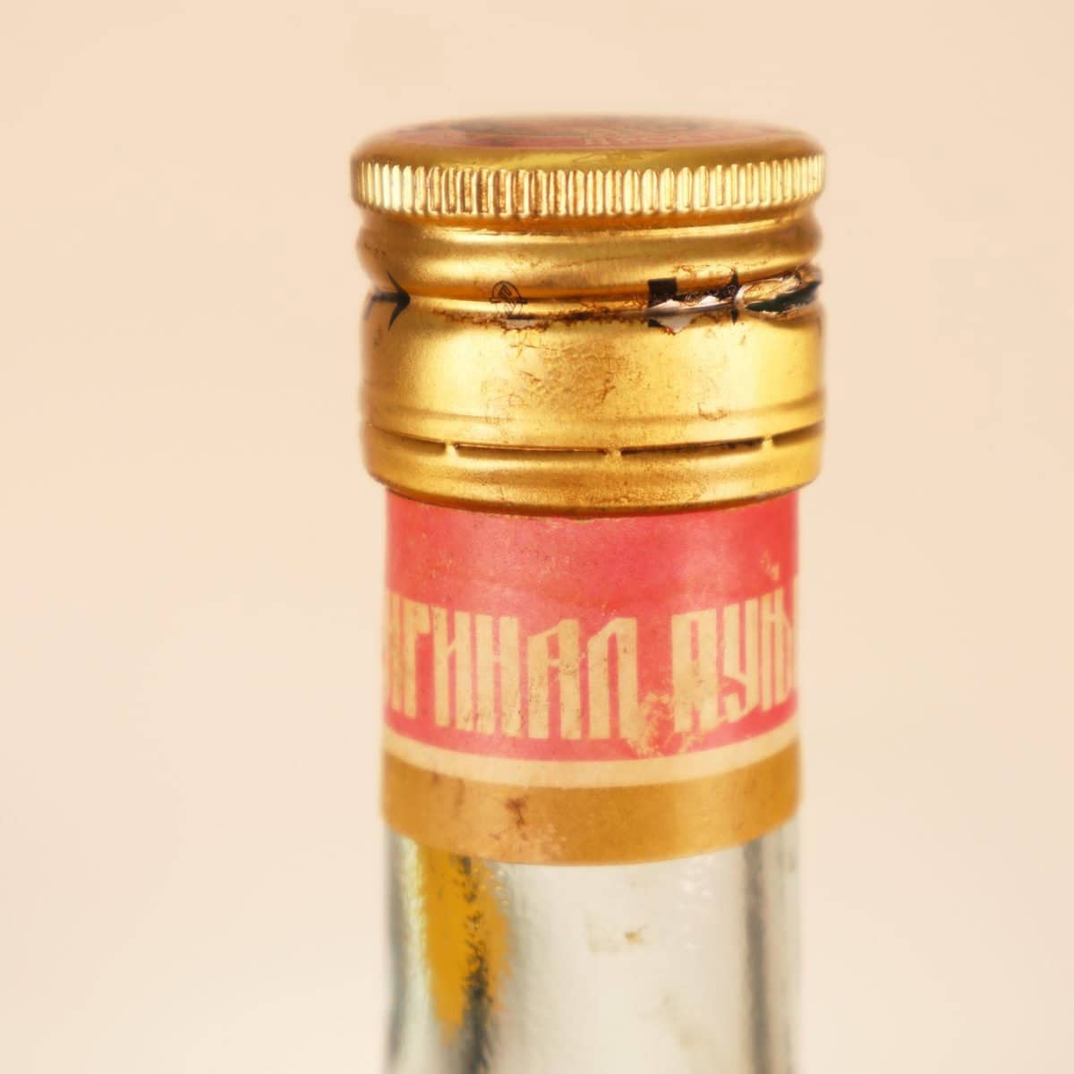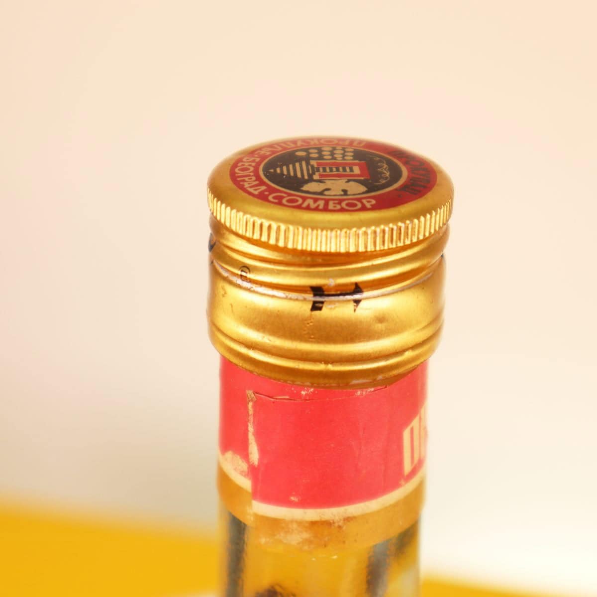 Questa bottiglia di rakija, un liquore tipico serbo, e' un oggetto affascinante per gli amanti dei spirits. Presenta un design vintage con etichetta colorata che richiama elementi della cultura s... Questa bottiglia di rakija, un liquore tipico serbo, e' un oggetto affascinante per gli amanti dei spirits. Presenta un design vintage con etichetta colorata che richiama elementi della cultura serba, rendendola un ottimo pezzo da collezione. La bottiglia e' realizzata in vetro trasparente con un tappo dorato, esaltando la qualita' dell'alcol contenuto. Perfetta per essere esibita in una cantina o utilizzata in occasioni speciali, la rakija e' un simbolo di ospitalita' nella tradizione balcanica. Questa bottiglia, databile negli anni '70, e' in buone condizioni generali, con lievi segni d'usura che ne attestano la storia. Altro